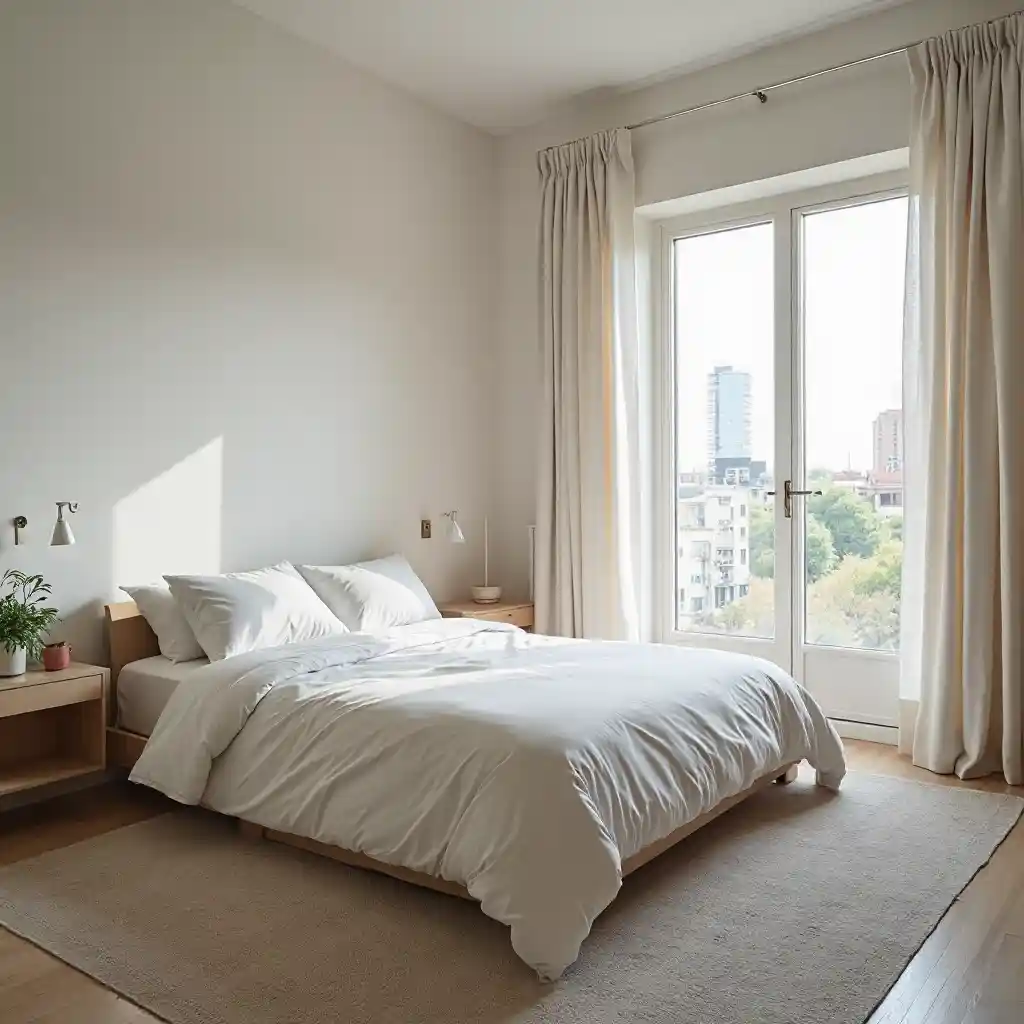 Pemandangan dari tempat tidur di kamar tidur dengan jendela di sebelahnya - jendela hanya di satu sisi ruangan. Ruang minimalis, tidak ada tirai, karpet, dan tidak ada dekorasi yang tidak perlu.