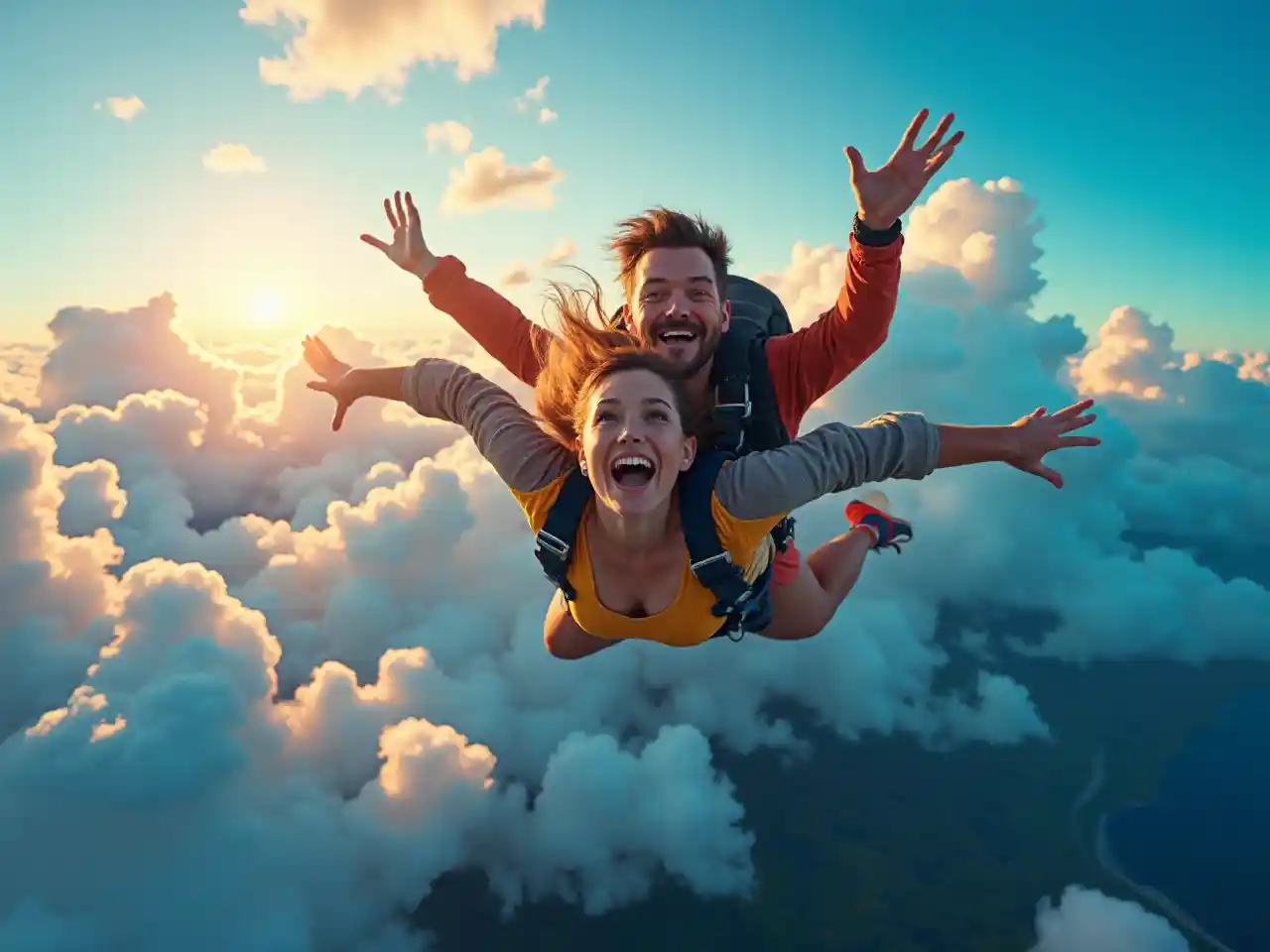 Sepasang pria dan wanita melakukan skydiving di langit yang cerah dan berkabut, ditangkap dalam realisme yang menakjubkan. Warna-warna cerah dan energik mendominasi seluruh pemandangan, dengan langit biru gelap kontras dengan awan putih yang bergulung-gulung, dengan sentuhan merah muda dan oranye di bawah sinar matahari. Matahari menggantung rendah di cakrawala, melemparkan cahaya keemasan yang hangat, menyoroti ekspresi kegembiraan dan keheranan mereka. Postur dinamis mereka menyiratkan jatuh bebas, dengan rambut dan pakaian mereka mengalir liar tertiup angin. Di bawahnya, sekilas pemandangan hijau subur dan air berkilauan menambah kedalaman pemandangan. Suasana keseluruhan menggembirakan, penuh petualangan, dan dengan latar belakang langit yang hidup dan berwarna-warni, membangkitkan sensasi jatuh bebas. Gaya ini terinspirasi oleh pencahayaan sinematik, detail yang sangat realistis, dan nuansa yang dinamis.