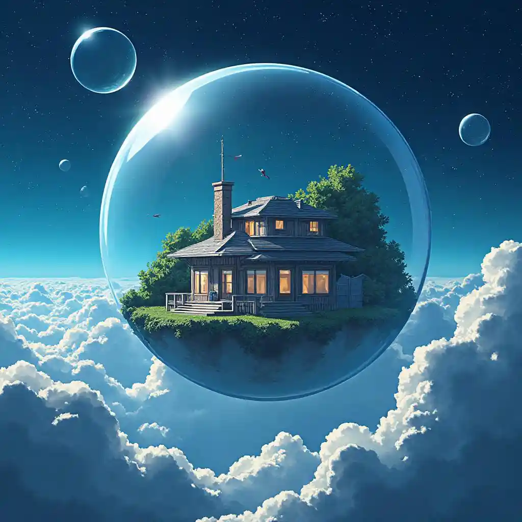 Gaya anime jepang, sci-fi, komedi, ((((ruang kosmik))))), hamparan tak terbatas alam semesta, rumah terpisah dalam bola transparan, tr kecil