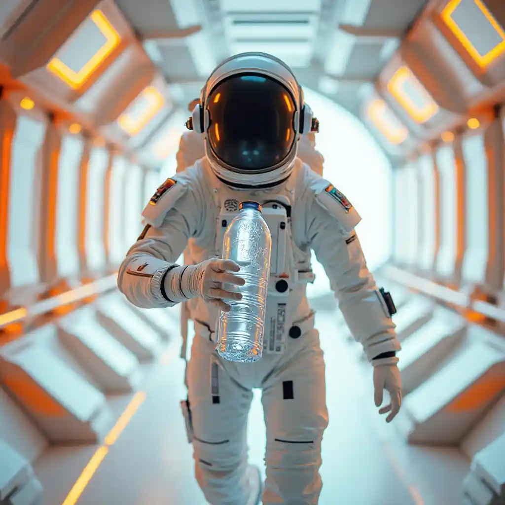 "Seorang astronot, mengenakan setelan putih halus dengan tanda-tanda berpakaian halus, dengan anggun mengambang di dalam pesawat ruang angkasa modern. Terlihat di depan mereka memegang botol air jernih yang membalikkan cahaya lembut dengan latar belakang panel kontrol yang bercahaya. Palet warna berpusat pada aksen oranye yang semarak dan nuansa putih yang menyegarkan, menciptakan kontras yang tajam. Adegan minimalis namun menawan ini menekankan botol air sebagai simbol hidrasi di kedalaman ruang angkasa.