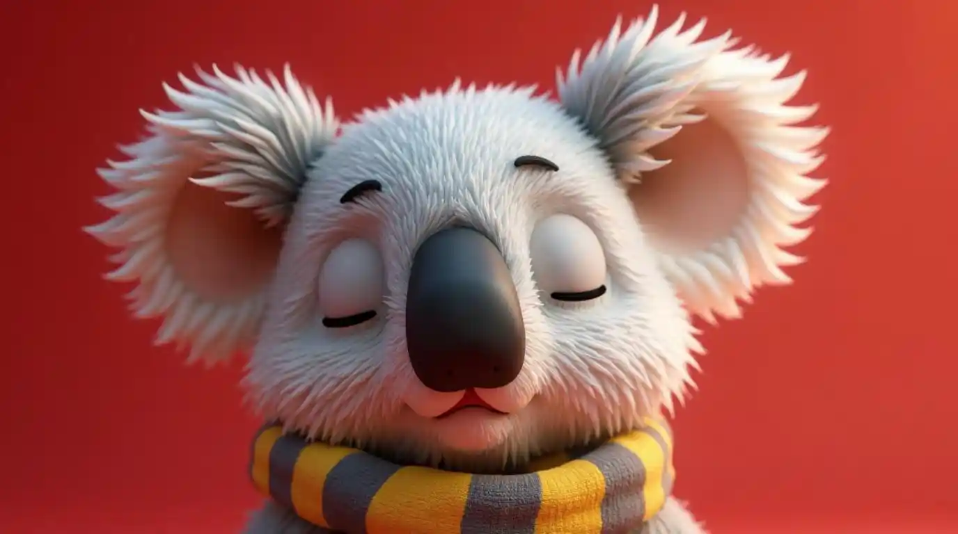 Close-up yang ekstrim dari wajah koala, tidur di atasnya, dalam desain karakter animasi bergaya chibi. Hewan yang terinspirasi oleh seni rakyat Slavia dengan bulu putih dan abu-abu dan garis-garis kuning. Pemotongan lensa telefoto sudut dinamis. Koala mengenakan olahraga dengan syal bergaris dengan latar belakang merah, dalam desain karakter tanah liat, patung, dan rendering 3D, kedalaman lapangan, cacat, lensa kabur, populer di Fanbox Pixiv, dalam gaya film animasi Pixar.