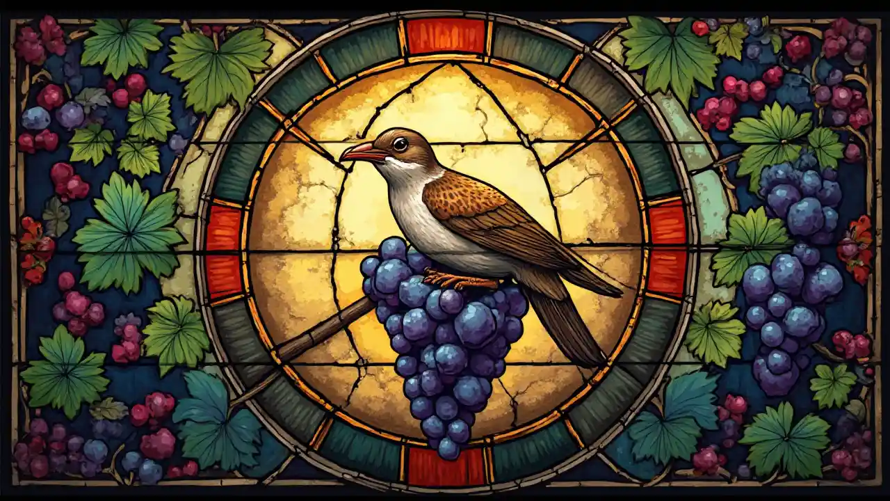 Ilustrasi Burung Kaca Patri Makan Anggur