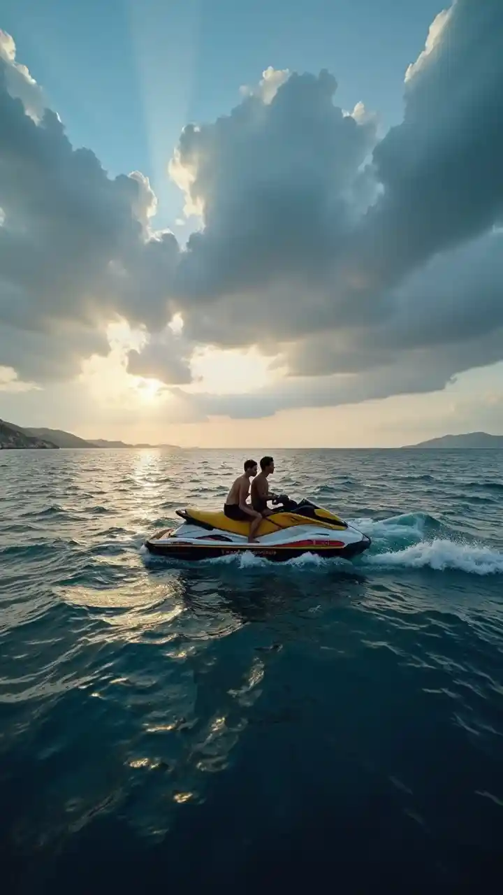 G é n é r é moi un ciel é toil é la sur la mer avec un jet ski il fait sombre on voit pas trop la personne