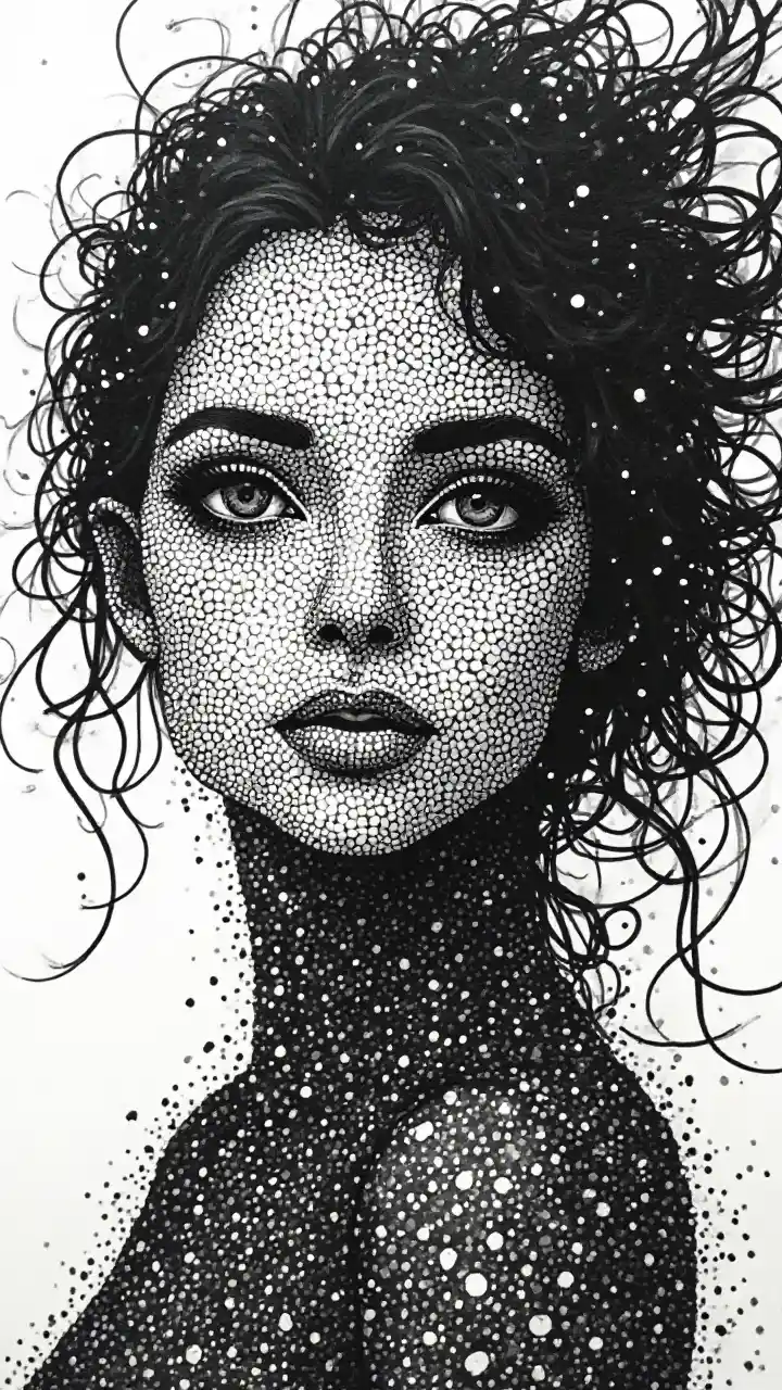 Seni pointilis, wanita, wajah terpusat, gaya pointilis George Seurat dan Paul Signac, hiperrealistis, hiperdetail, simetris, megah, fantasi gelap, lukisan hitam-putih, tanpa shading, rumit. 8 bit, pixelated, dinamis,