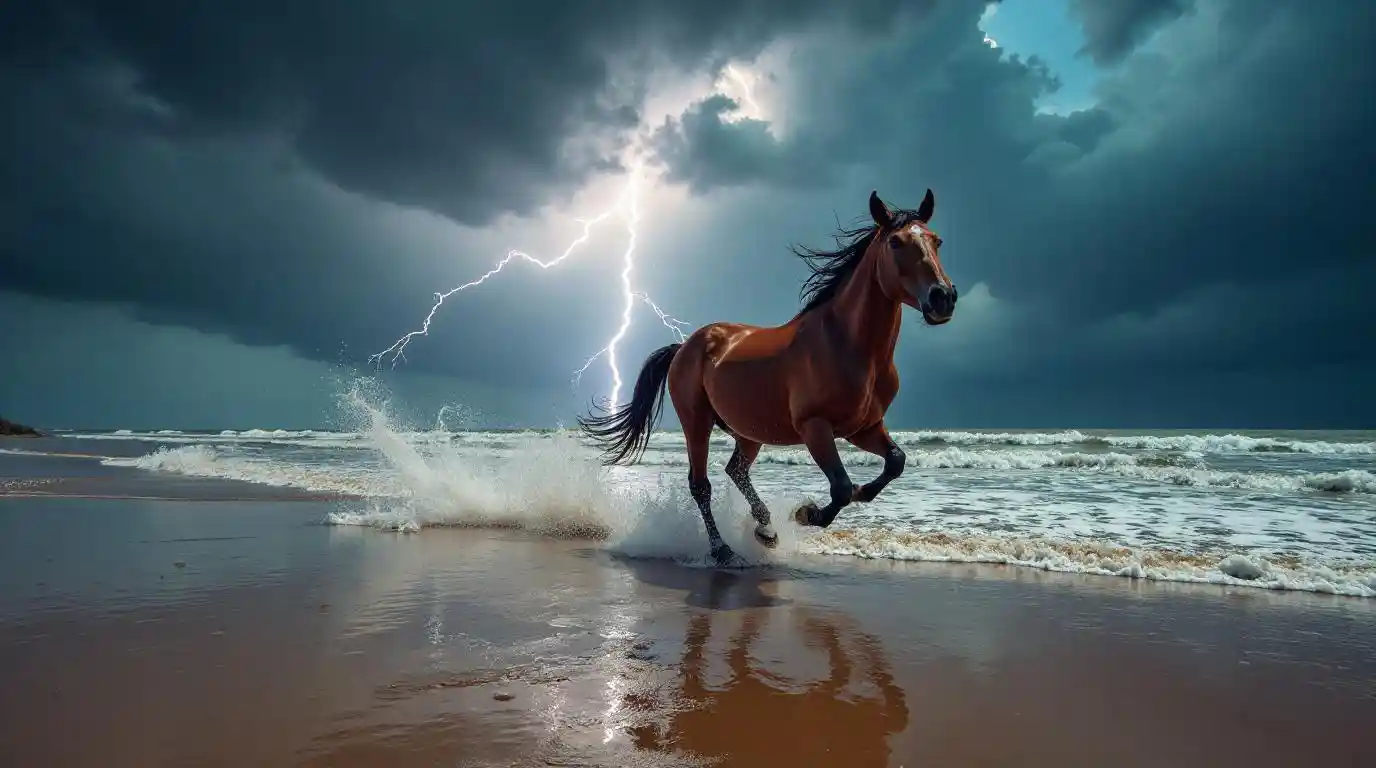 Adegan yang mengasyikkan, seekor kuda melesat di atas pasir di bawah badai petir yang dramatis. Kilatan petir berderak melalui kegelapan, awan yang berputar-putar, memberikan bayangan dramatis di pantai. Kuda itu tertangkap saat berlari di tengah jalan, dan saat berlari di tengah ombak, ada percikan air di sekitarnya. Cuaca yang intens bertabrakan dengan semangat kuda, menggambarkan rasa kebebasan yang intens. Warna yang kaya dan kontras meningkatkan efek dramatis saat ini.