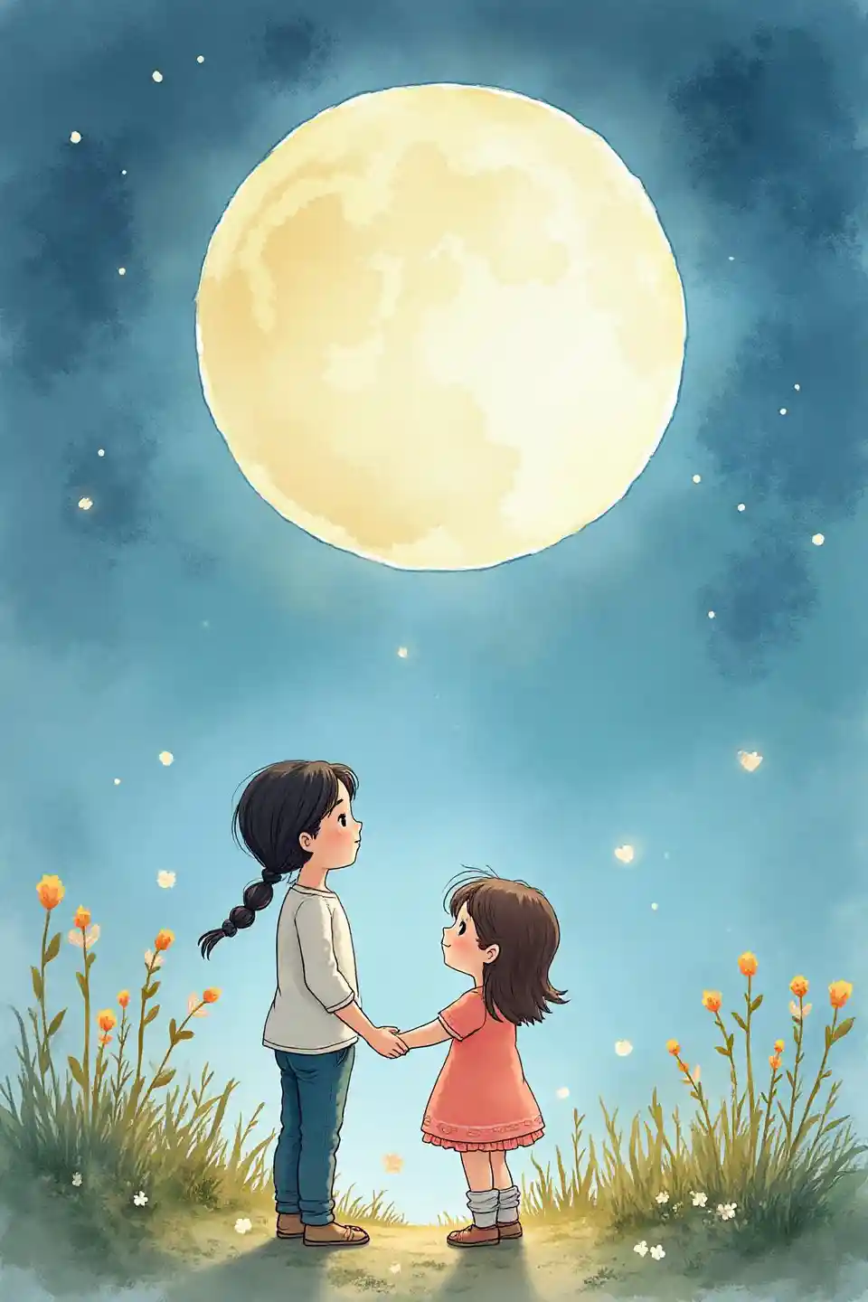 Sampul buku cerita, ilustrasi cat air, karakter muda, gaya lucu, font gaya tulisan tangan, warna pastel lembut, komposisi lembut, pecah,, bulan besar, dalam t