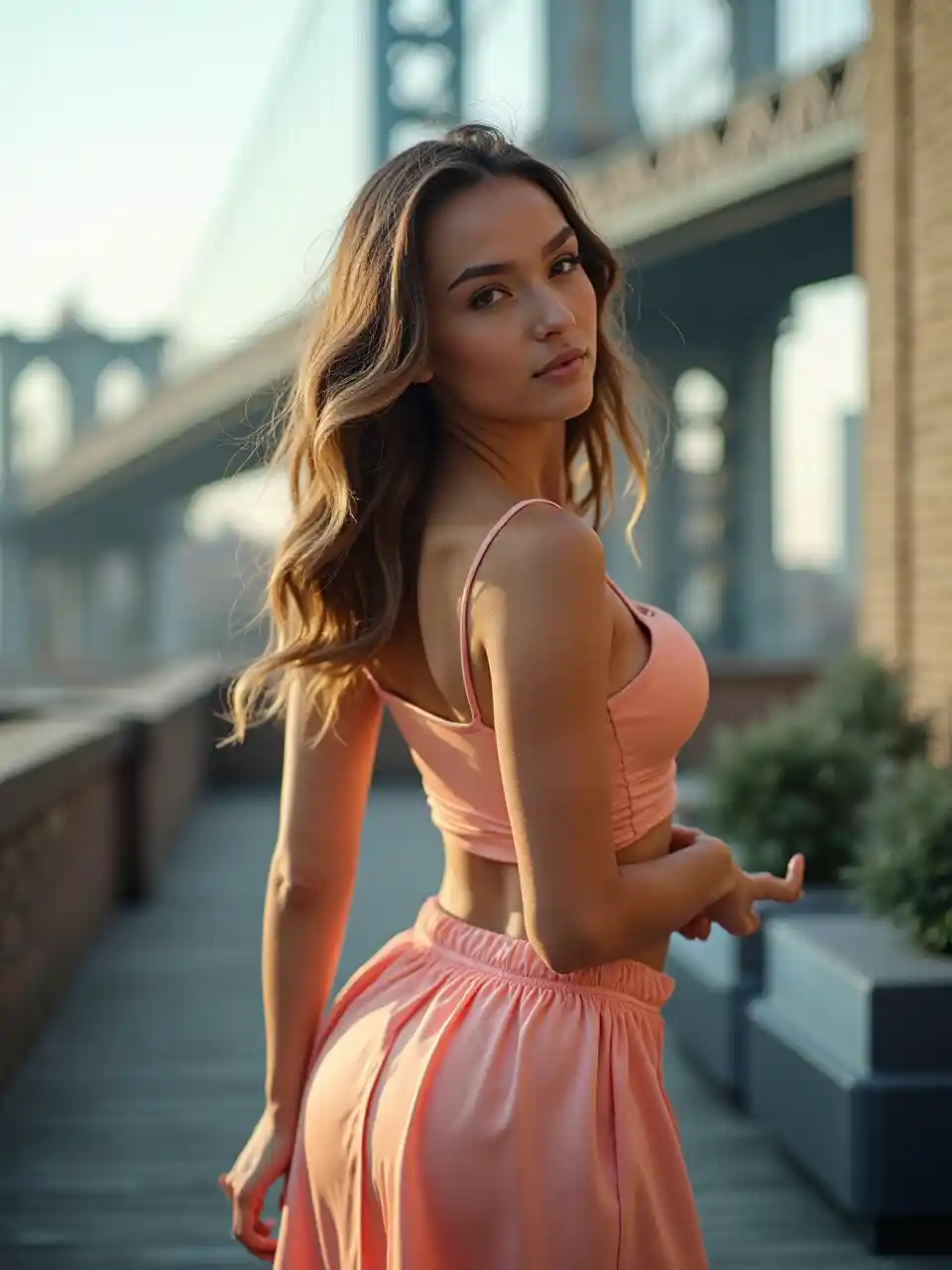 Sebuah foto gaya jalanan yang menawan, seorang wanita muda yang menawan dan ramping memancarkan pesona yang menyenangkan, berdiri dengan percaya diri di atas atap yang tinggi dengan Jembatan Brooklyn yang ikonik di latar belakang. Dia mengenakan gaun satin salmon mini yang halus, kemilau tembus pandang, dan angin sepoi-sepoi yang lembut memberinya banyak warna. Tatapannya yang menawan ditangkap oleh titik fokus, dan ketika kulitnya yang lembut menangkap cahaya, itu membangkitkan suasana hati yang tenang dan alami. Palet adegan memperkaya aksen salmon, aquamarine, dan galaxy blue, menciptakan keseimbangan visual yang harmonis. Detail artistik yang unik termasuk cairan emas yang menawan yang mengalir lembut di wajahnya, menambahkan sentuhan edgy. Dibidik dengan lensa Canon 5D Mark IV dan Canon EF 50mm f/1.2 L USM yang memiliki POV f/2.8 yang memberikan gambar mendebarkan yang intim dan menarik perhatian, dengan resolusi 16k dan rasio aspek 4:5 untuk gaya yang menggugah dan lembut.