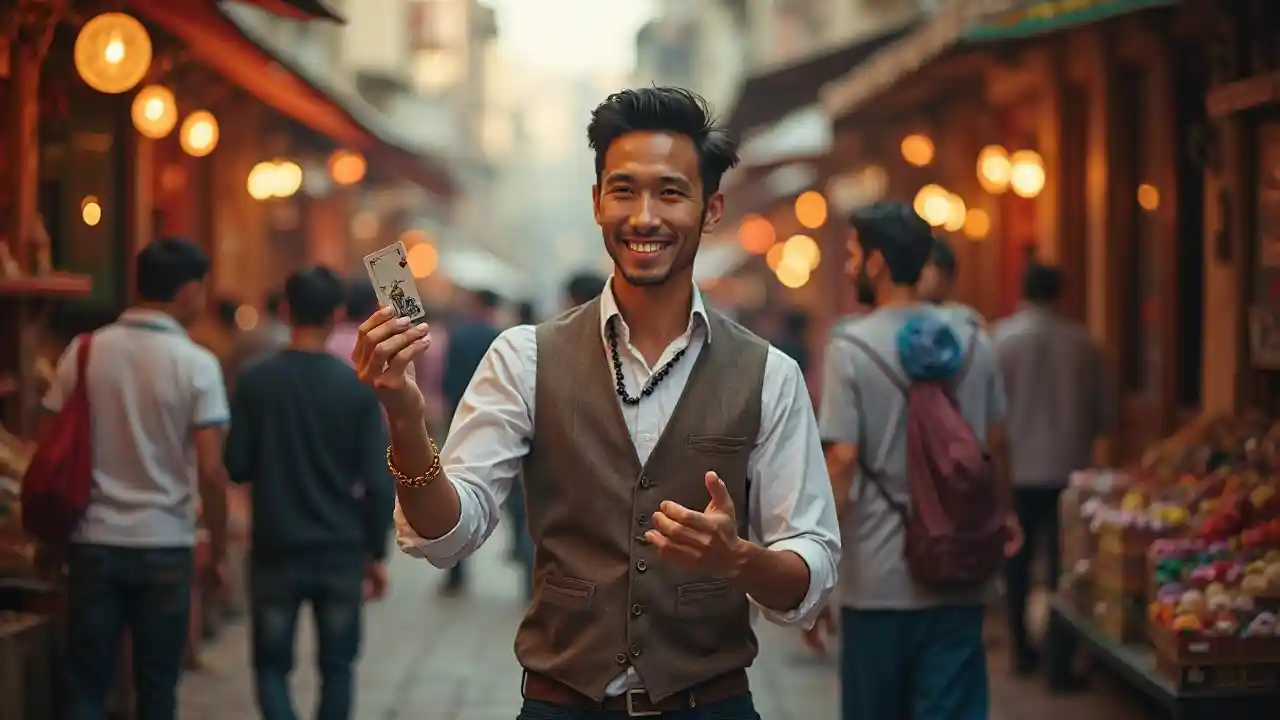 Melakukan trik sulap jalanan di pasar terbuka yang ramai, seorang pria Asia berusia 30-an bersinar dengan rompi yang dibuat khusus. Kios-kios berwarna-warni dan kerumunan yang ingin tahu membingkainya, dan trik karismatik dan tangannya yang cekatan memancarkan pesona dan misteri di pasar yang hidup dan eksotis.