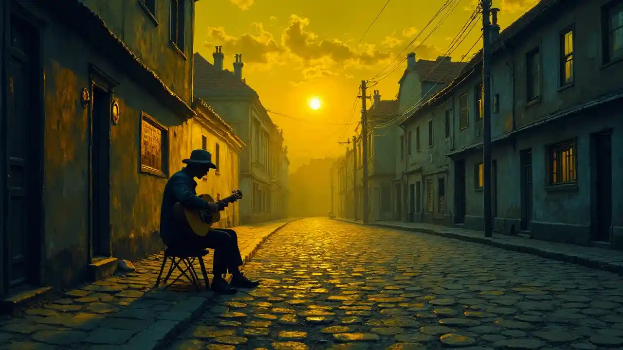 Anak laki-laki bermain gitar di jalan yang gelap dan kosong, kegelapan kuning, lukisan Van Gogh