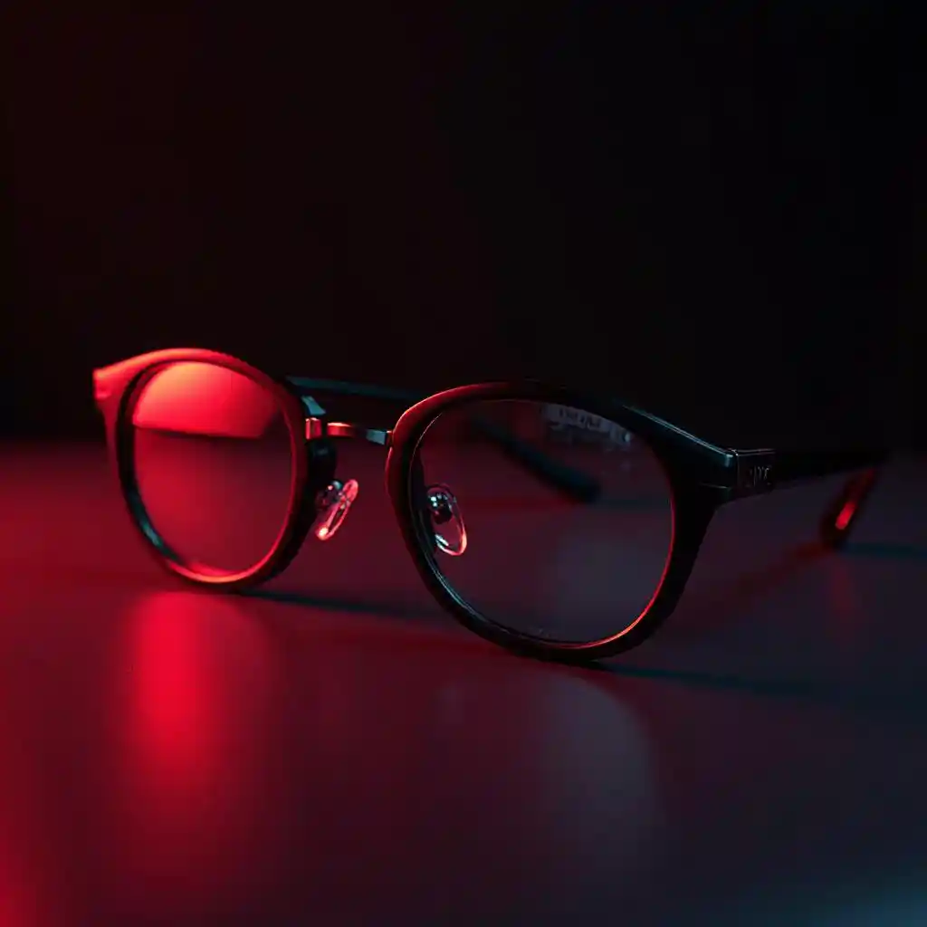 Sebuah foto hyper-realistis dalam pengaturan studio dengan sepasang kacamata yang ramping dan modern. Kacamata ditempatkan pada permukaan reflektif dengan latar belakang hitam gelap. Lampu neon merah dengan lembut menerangi pemandangan, menciptakan refleksi halus pada lensa dan bingkai, menambah kedalaman dengan bayangan lembut. Pencahayaan menyoroti bezel dan detail lensa untuk menciptakan tampilan profesional dan halus, seolah-olah itu adalah katalog mode kelas atas.
