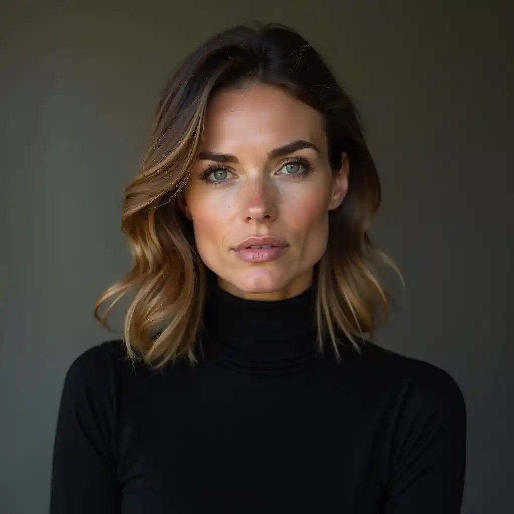 Wanita bule, model rambut midi, memakai turtleneck hitam ketat