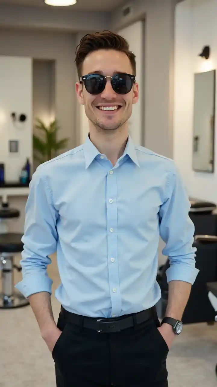 Di lingkungan yang cerah dan modern, seorang pria muda berdiri dengan percaya diri dengan senyum hangat, mengenakan kacamata hitam bergaya yang meningkatkan sikapnya yang optimis. Kemeja gaun biru mudanya diselipkan rapi ke dalam celana panjang hitam, memberikan tampilan yang tajam dan profesional. Latar belakang dalam nada yang lembut dan netral serta furnitur modern, seperti meja lipat bergaya yang dilengkapi dengan berbagai gaya rambut dan produk kecantikan, menyiratkan suasana barbershop. Suasana keseluruhan santai dan halus, menyiratkan ruang yang menyeimbangkan gaya dan kenyamanan, sementara pencahayaan menciptakan suasana yang menggoda yang menjadikannya latar belakang yang ideal untuk interaksi.