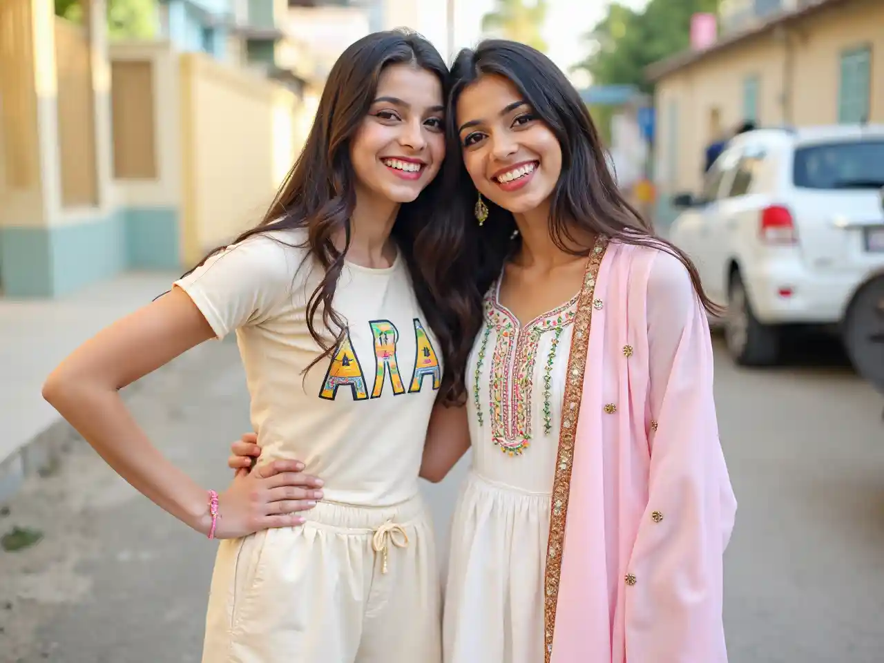 Kedua wanita muda itu berpose erat, memancarkan kegembiraan dan persahabatan di lingkungan luar yang semarak. Seorang gadis mengenakan atasan kasual berwarna krem dengan huruf "ARAR" yang dinamis, dipadankan dengan celana berwarna terang untuk menampilkan suasana santai namun tetap modis. Para pendampingnya mengenakan pakaian putih tradisional dengan elemen dekoratif dan mengenakan dupatta merah muda di satu bahu, memancarkan pesona budaya. Latar belakang mengungkapkan sedikit kehidupan perkotaan, mobil yang diparkir dan dinding yang diterangi sinar matahari menambah suasana yang hidup. Senyum lebar dan mata berbinar mereka menyampaikan perasaan perayaan dan persahabatan yang membuat momen ini terasa hangat dan menggoda.