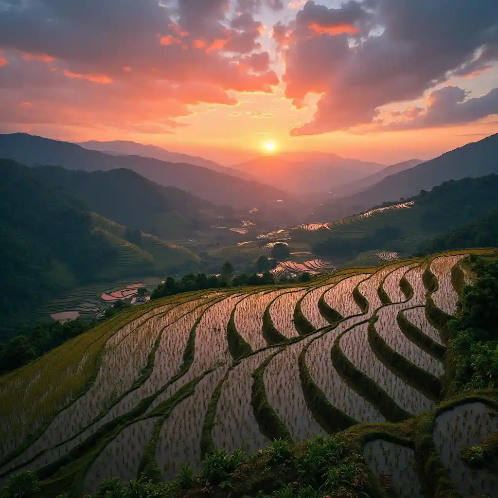 Pantulan Matahari yang Terbenam di Sawah Terasering