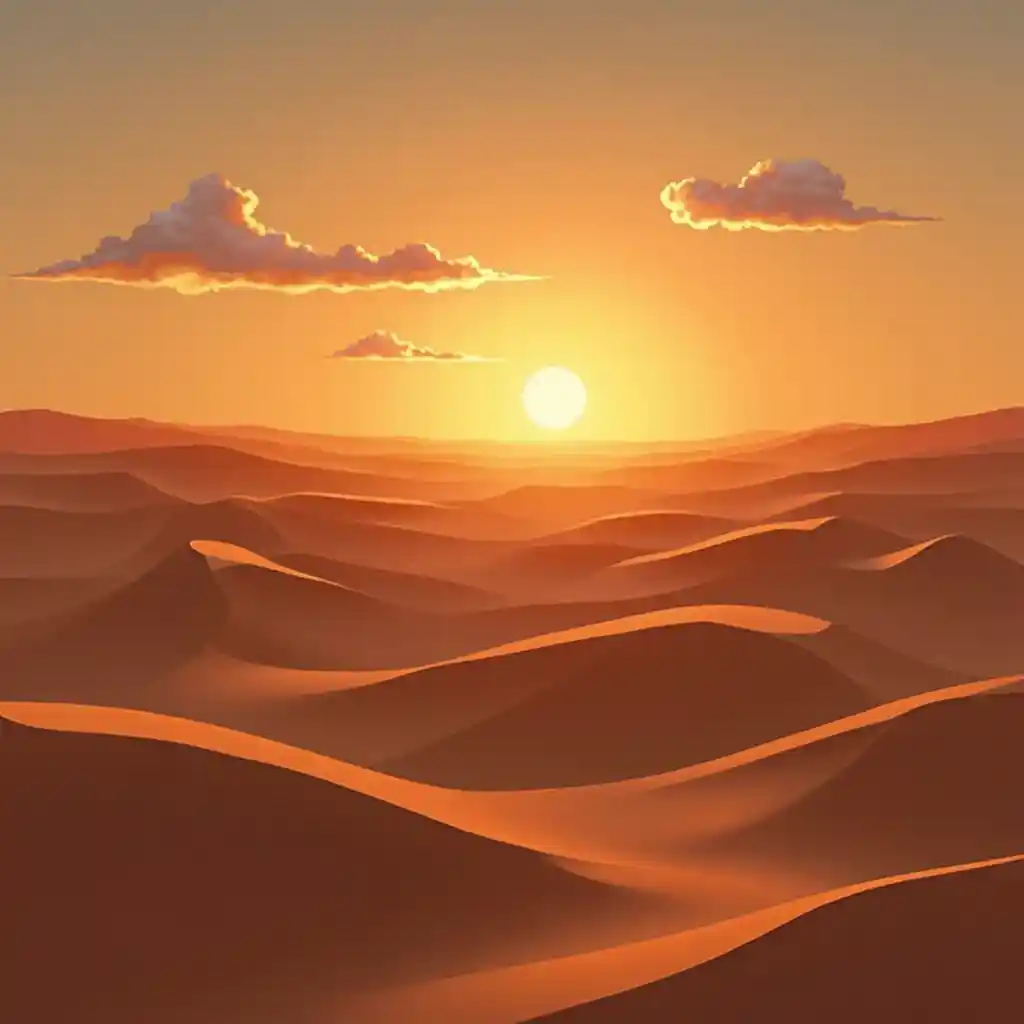 Sebuah padang pasir dengan gundukan pasir, menemani matahari terbenam. Di langit, di kejauhan, beberapa awan datar, salah satunya mencegat sinar matahari. Panas membuat fatamorgana di kejauhan.