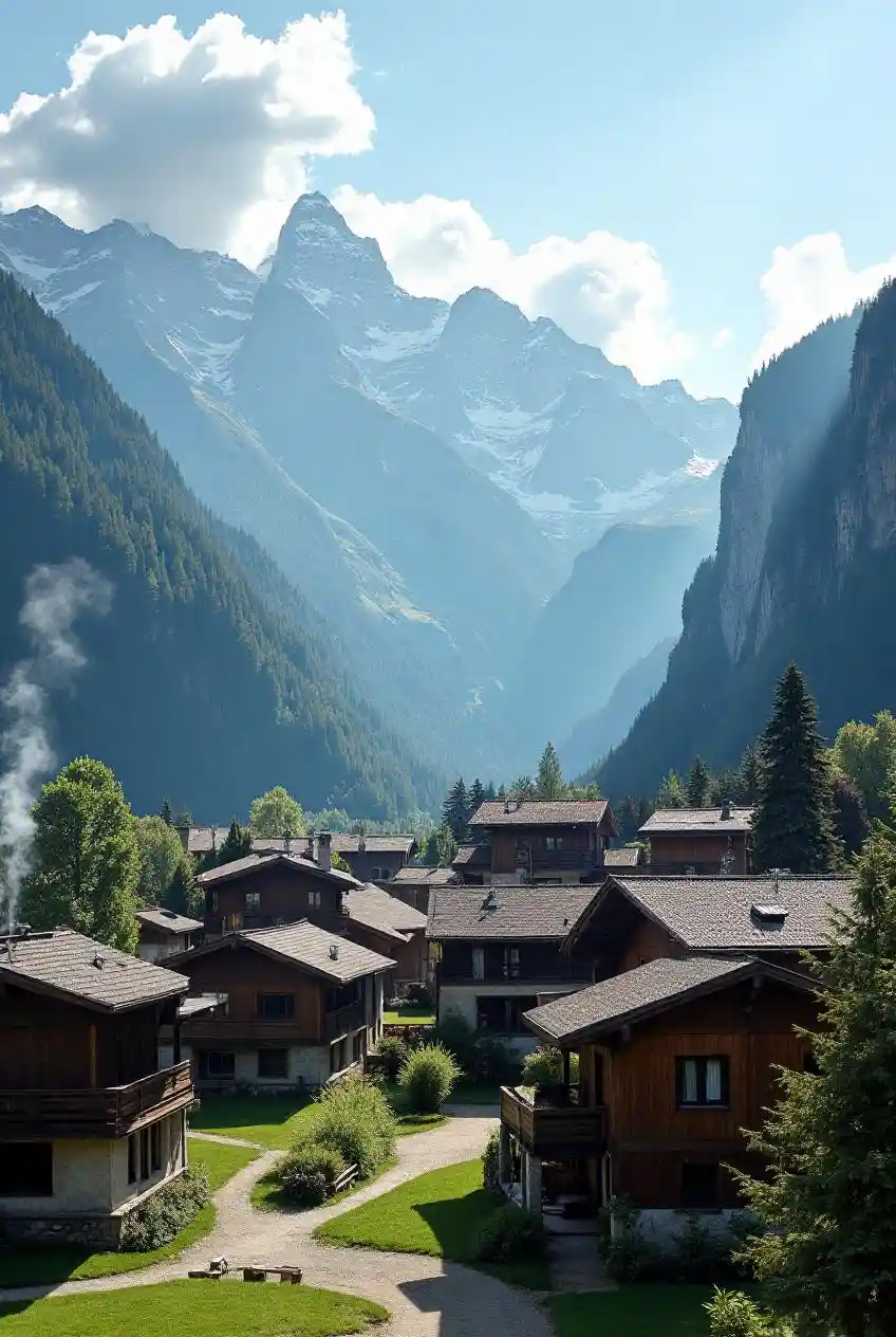 JosephSebuah desa kayu kecil di Swiss, cerobong asap mengeluarkan asap tebal, dan pegunungan Alpen yang menjulang tinggi membingkainya.
