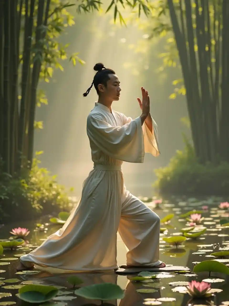 Berlatih tai chi di hutan bambu, seorang pria Asia berusia 20-an bersinar. Kabut pagi dan kolam teratai membingkainya, dan gerakannya yang halus memancarkan keanggunan disiplin dan kekuatan pemuda di lingkungan yang tenang dan alami.