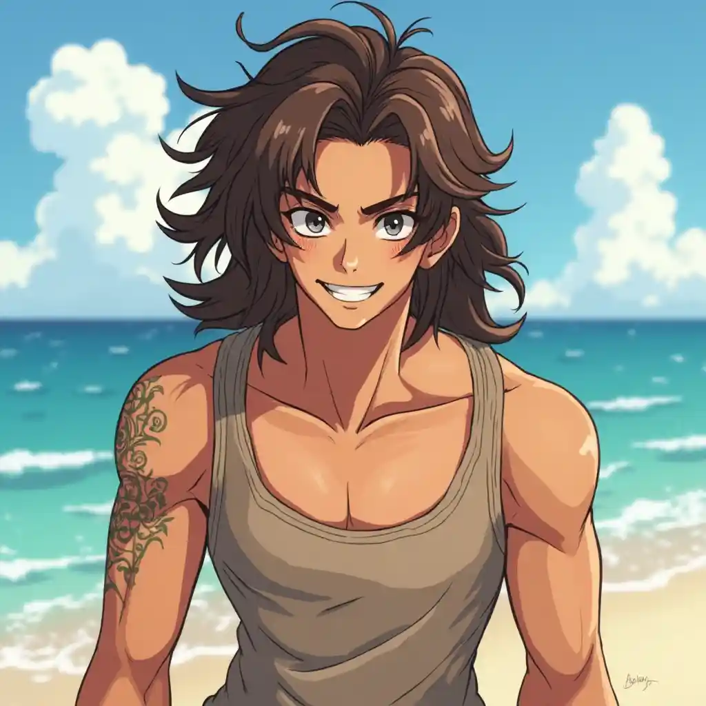 Slim tampan Tan kulit anime laki-laki bergelombang rambut coklat tersenyum Yongcoco macho garis rahang tersenyum di pantai memakai tank top, senyum menawan → rambut panjang memiliki tato Samoa di lengan kiri