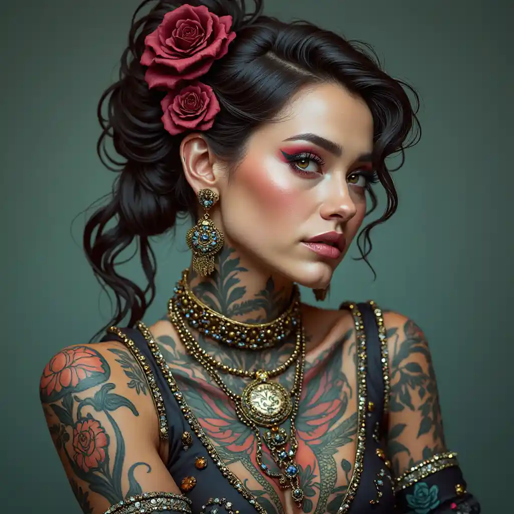 Potret hiper-realistis dari seorang wanita cantik bertato mengenakan pakaian berwarna-warni dengan detail rumit dan perhiasan futuristik.