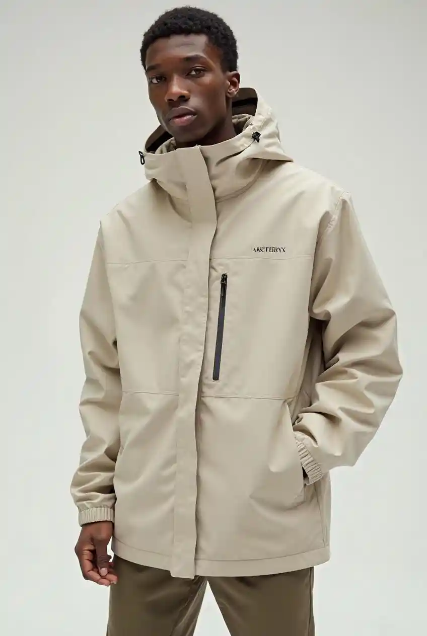 DanielOrang yang memakai batu krem off warna putih teknologi pakaian pakaian luar, fotografi fashion outdoor minimalis, techwear, Arc'teryx