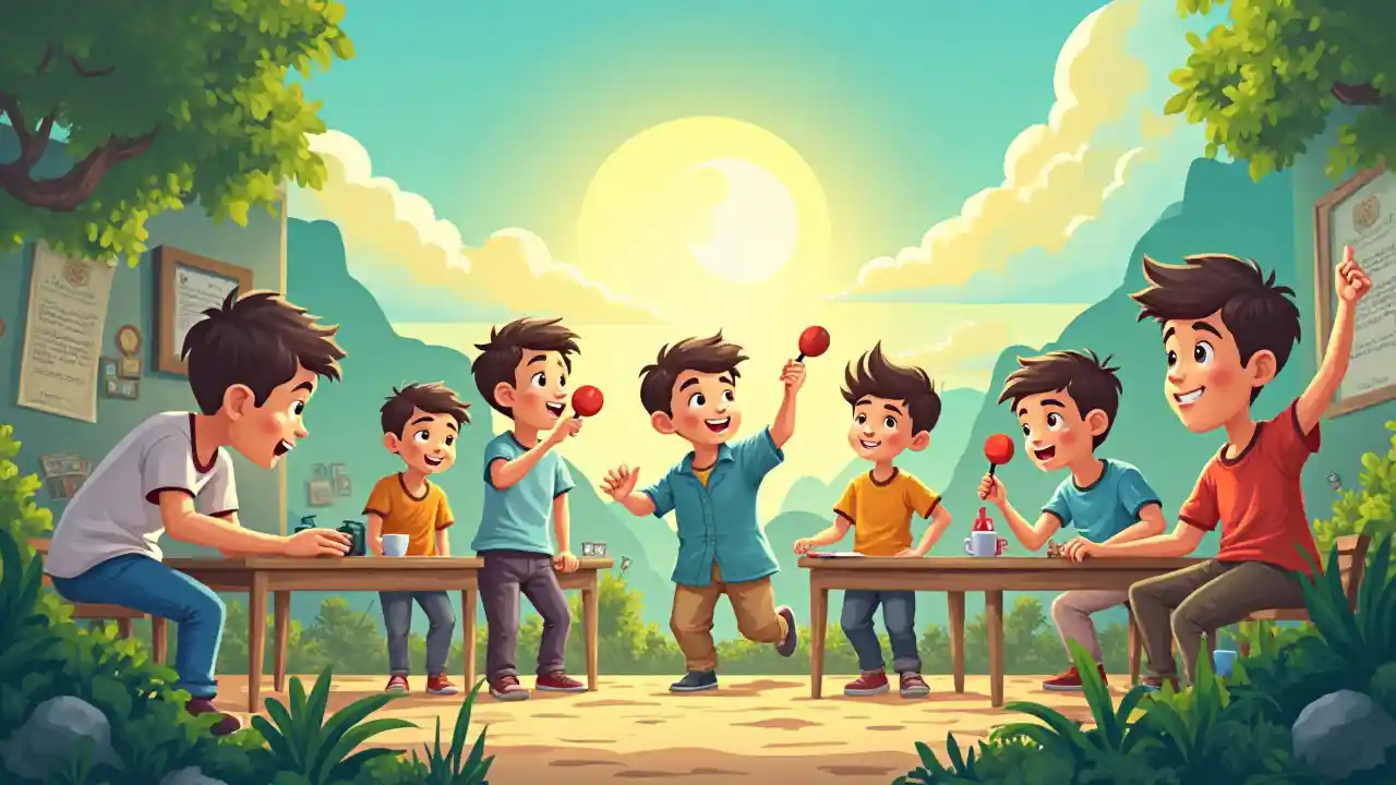 "Desain Poster A3 untuk Program Musim Panas 1.**Sekelompok anak laki-laki remaja animasi **Terlibat dalam: - Belajar **Bahasa Inggris **Di salah satu ruang kelas dengan poster Al Qur 'an - Bermain **Tenis Meja **Energi yang kompetitif - Latihan **Martial Arts **(misalnya Kick-Dojo) - Arsitektur **Robotika **Bekerja dengan tim - Sedang dikerjakan **Kaligrafi **Dengan tinta dan kertas - Lukisan **Alam Adegan **Warna-warni cerah - Trekking **Perkemahan luar ruangan **Dengan wajah tersenyum 2.**Gaya visual: ** - Ultra-realistis, warna-warna cerah, pencahayaan seperti bioskop - Komposisi kohesif dengan latar belakang'matahari terbit 'yang melambangkan energi 3.**Palet warna: ** - Dominan: Turquoise Islami + Emas Kuning + Putih - Aksen: Hijau (melambangkan pertumbuhan) dan Merah (energi)