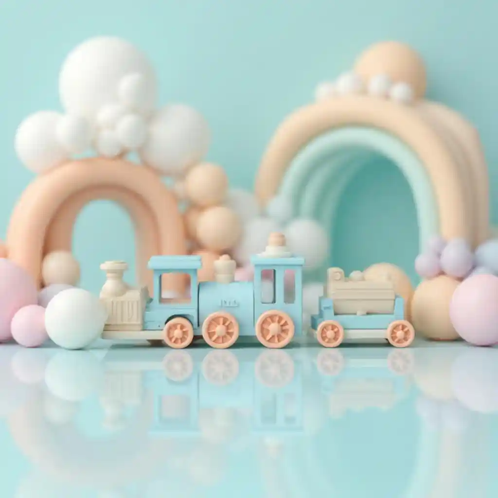 Adegan kereta mainan berwarna pastel, aneh dan lucu. Mainan kereta api, warna biru muda dan kuning krem, dilengkapi dengan berbagai balon warna pastel yang disusun menjadi elemen seperti lengkungan dan awan. Lengkungan peach lembut dan pink muda yang mendukung dinding biru muda/biru. Awan berwarna pink muda, putih, abu-abu muda. Balon dalam warna oranye lembut, persik, hijau kebiruan muda, dan sedikit lavender. Kedalaman panorama, warna kontras tinggi dalam keindahan yang lembut dan melamun. Refleksikan adegan pada permukaan biru muda yang halus untuk menambahkan efek cermin pada komposisi. Pesta anak atau alat peraga foto. Suasana ceria yang menyenangkan. Pencahayaan profil tinggi yang menekankan warna yang hidup dan refleksi yang cerah. Sederhana, gaya dekoratif. Kereta mainan miniatur yang terperinci. Sudut pandang close-up; pemotretan studio.