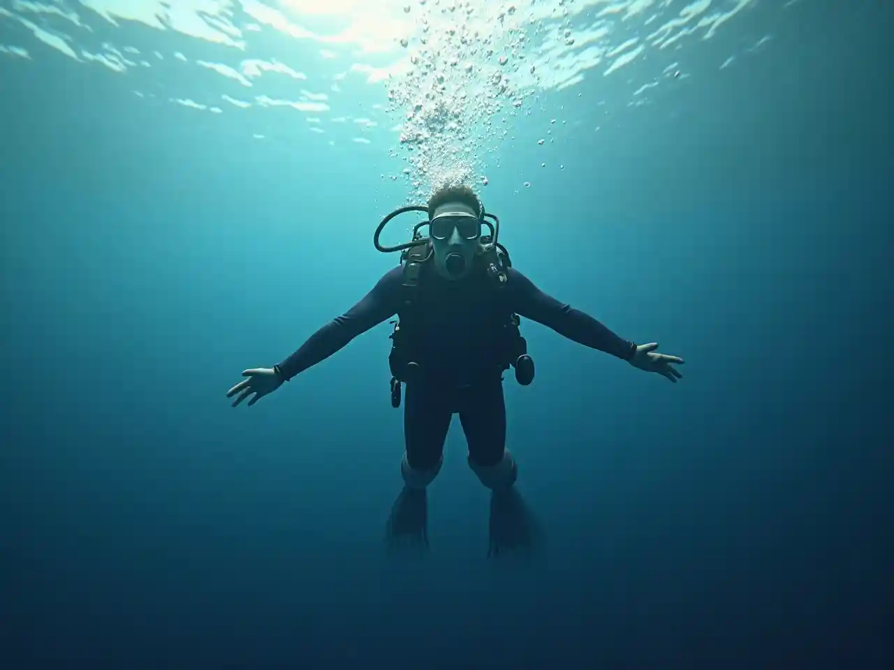CalebSeorang penyelam berenang di bawah air dengan resolusi jernih, 4K HD 3D rendering