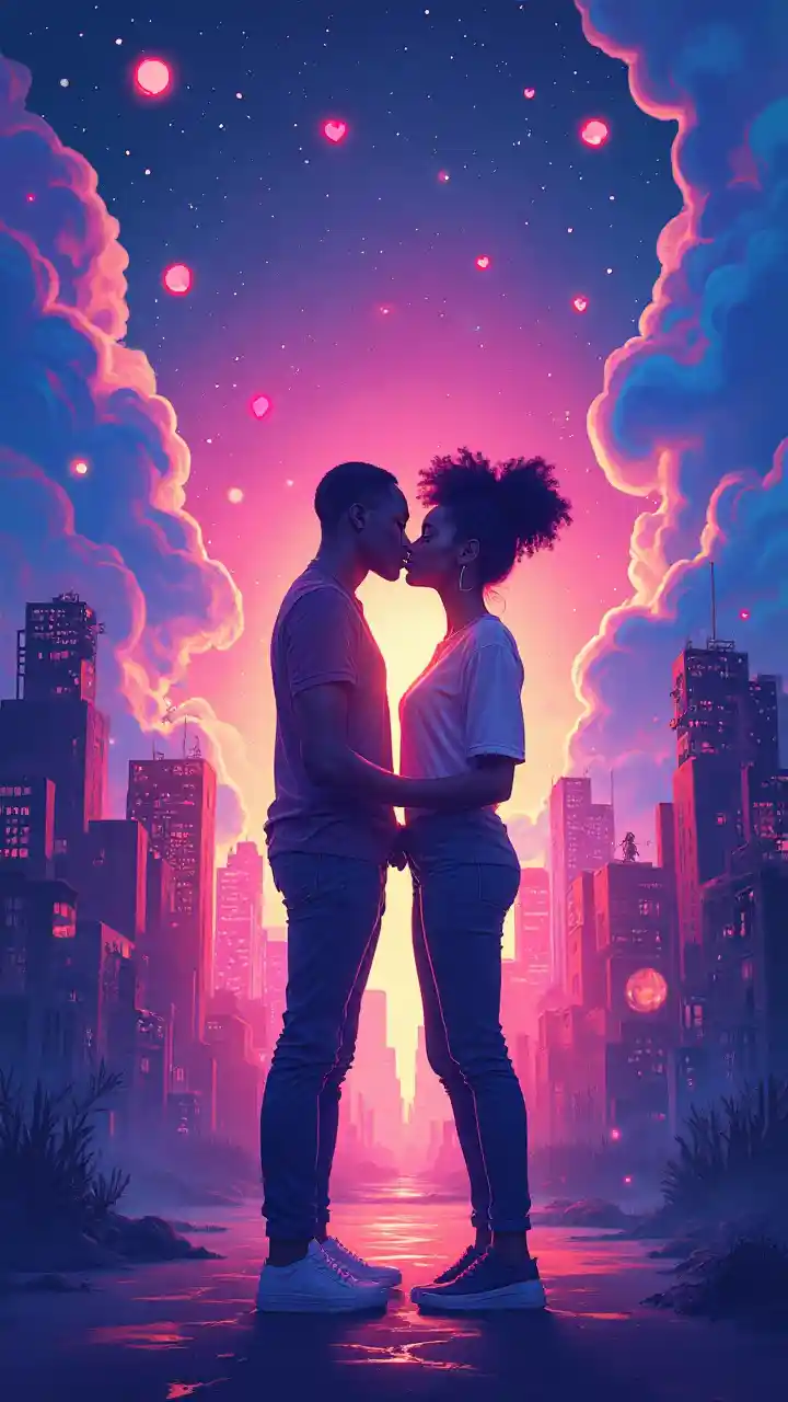 Ciptakan karya seni album dengan gaya fantasi, hidup, dan abstrak yang menangkap esensi cinta perkotaan, kreativitas, dan kebebasan. Palet warna: Warna asli: ungu tua, biru listrik, neon pink, orange hangat. Warna Sekunder: Pastel lembut seperti pink pucat dan biru lembut untuk menambah kedalaman dan kontras. Latar Belakang: Latar Belakang: Sebuah lanskap kota surealis yang memudar ke langit berbintang di alam semesta. Lanskap kota harus abstrak, dengan bangunan dan struktur dengan garis yang lembut dan mengalir, seolah-olah mereka menyatu dengan langit. Elemen: Memasukkan pola yang berputar dan melamun di langit dengan petunjuk awan yang menyatu dengan alam semesta. Latar belakang harus terasa seperti kota dan kehendak surga, menggabungkan dunia duniawi dan halus. Prospek: Fokus utama: Dua sosok – pria dan wanita – berdiri berdekatan, seolah berpelukan atau bersiap untuk berciuman. Bentuk mereka harus sedikit abstrak, dengan garis mengalir yang menghubungkan mereka dengan latar belakang, memberi kesan bahwa mereka adalah bagian dari dunia fantastis yang sama. Detail: mengelilingi pasangan dengan unsur-unsur ekspresi artistik, seperti percikan cat mengambang, catatan, bentuk abstrak, melambangkan kreativitas. Elemen-elemen ini harus tersebar di sekitar mereka, memberikan rasa gerakan dan energi. Efek: Cahaya: Cahaya yang lembut dan bercahaya dari pasangan ini menciptakan aura lembut di sekitar mereka. Cahaya ini harus menyatu dengan warna di sekitarnya, meningkatkan suasana yang fantastis. Elemen tambahan: Tambahkan bentuk halus dan tembus cahaya seperti hati dan gelombang yang beriak keluar dari pasangan, melambangkan penyebaran cinta dan kreativitas. Emosi keseluruhan: Emosi: Gambar harus membangkitkan euforia, hubungan yang mendalam, kebebasan artistik. Ini harus terasa seperti perayaan cinta dan kreativitas dengan sentuhan surealisme yang membuatnya terasa seperti mimpi yang indah dan bersemangat. Pastikan untuk menggunakan model Afrika-Amerika dan lampu yang lebih gelap
