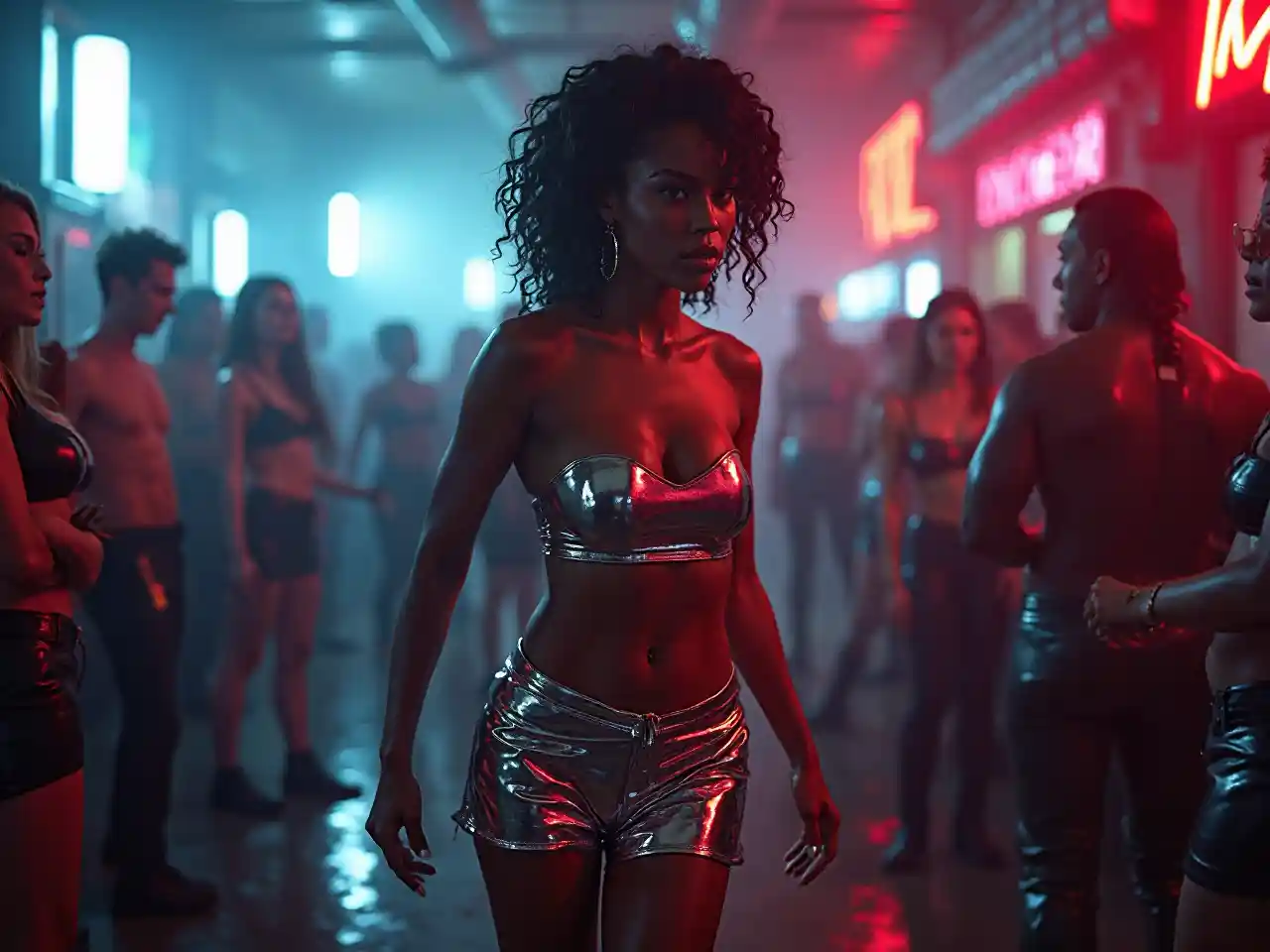 Seorang wanita kulit hitam berusia 25 tahun berjalan dengan kepala tegak di sebuah klub malam dystopian, mengenakan atasan crop berwarna metalik dan rok mini. Lampu neon berkedip dan penari kulit membingkai postur tubuhnya, kakinya yang kencang dan atasan berpotongan rendah memancarkan energi pemberontak dan daya tarik urban dalam lingkungan yang keras dan futuristik.