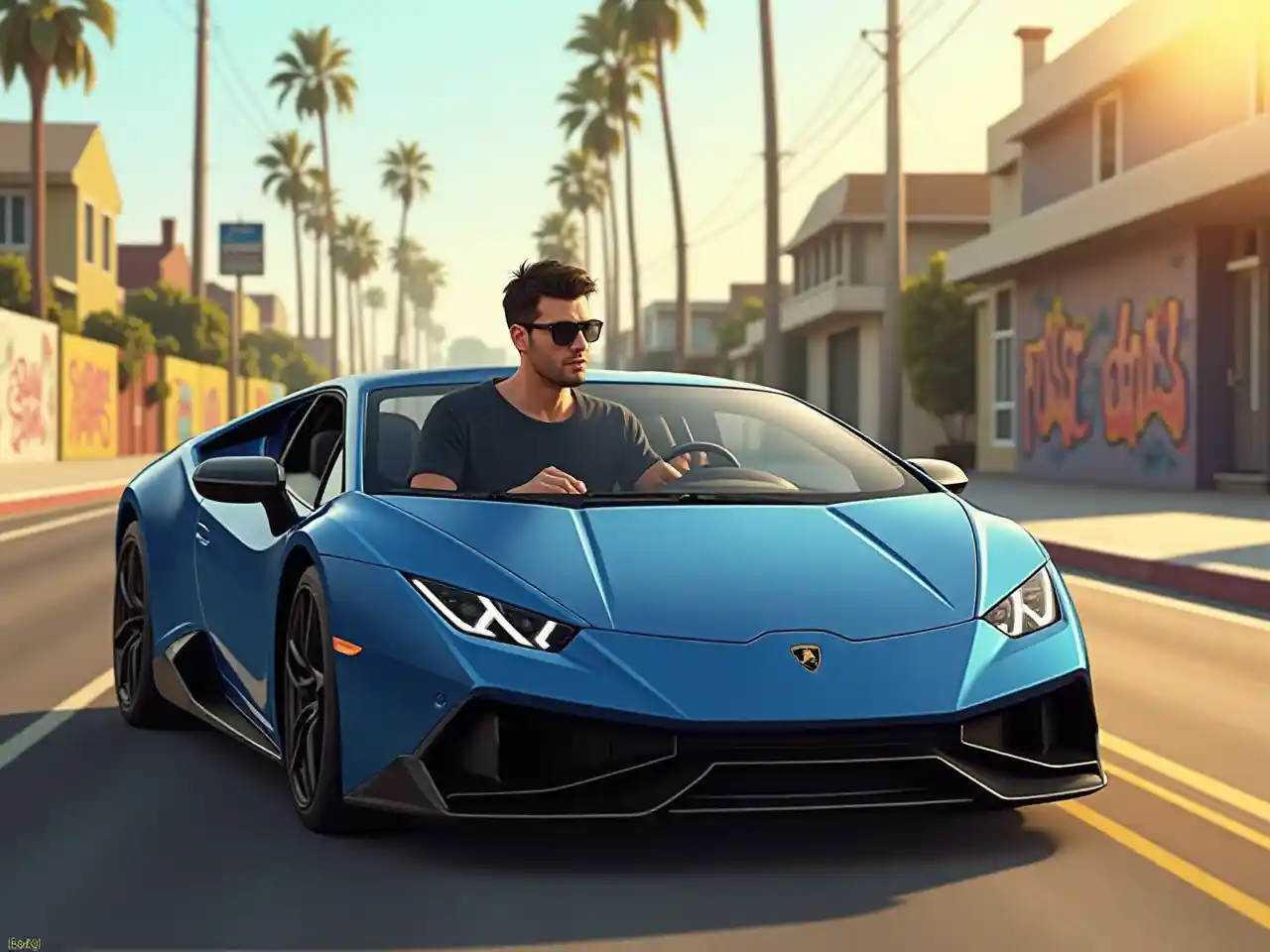Seorang pria berusia 18 tahun yang penuh gaya mengendarai mobil asli Lamborghini Huracán biru yang mulus di jalanan kota San Andreas yang penuh sinar matahari. Adegan menampilkan pohon palem, jalan lebar, dinding grafiti, dan langit Golden Hour, semuanya dalam satu detail, gaya permainan video yang terinspirasi GTA: San Andreas. Mengenakan kaus hitam kasual dan kacamata hitam, pengemudi terlihat percaya diri saat berlayar di sekitar blok kota. "
