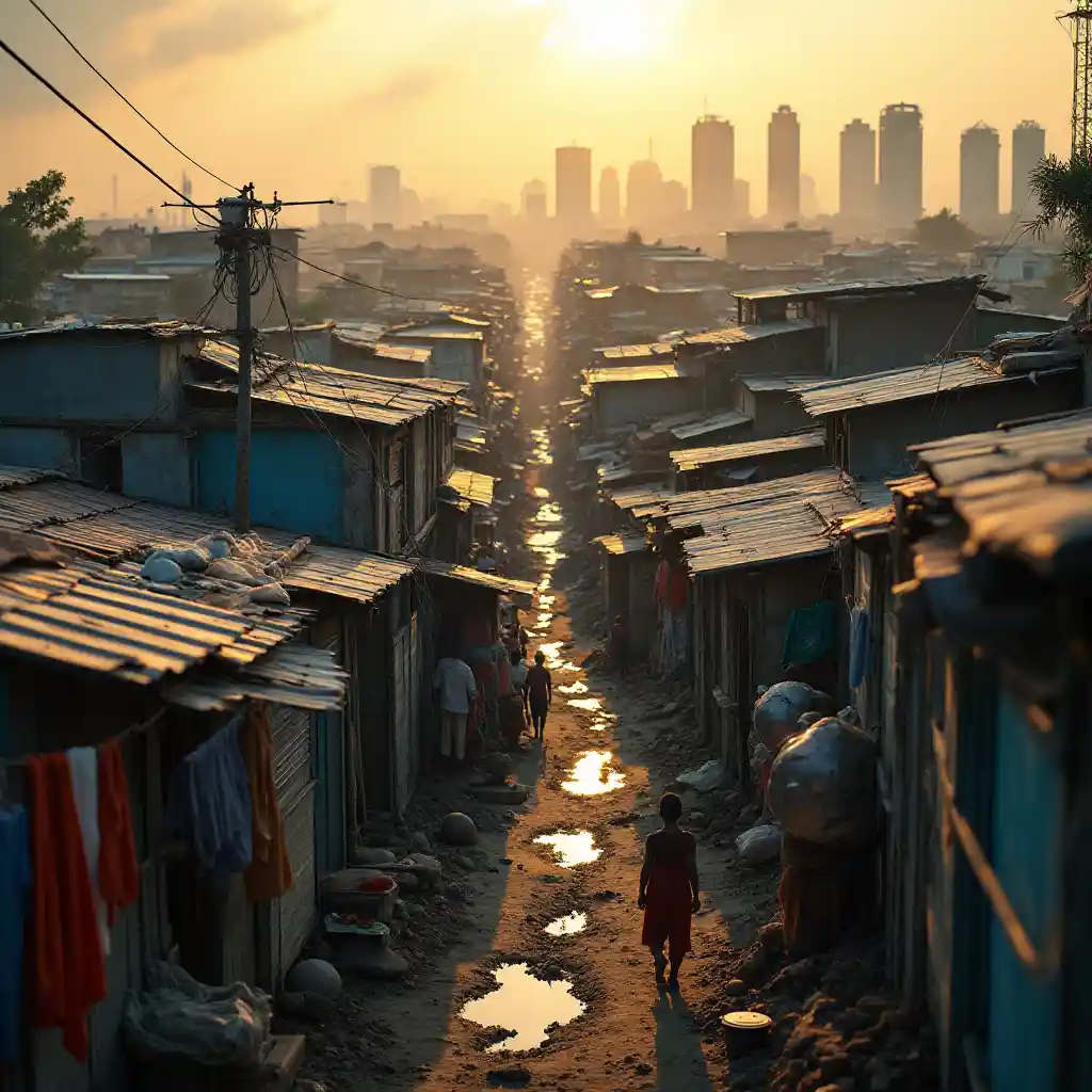Sebuah foto sudut lebar 8K yang sangat realistis yang mengambil adegan di prime time dari daerah kumuh perkotaan yang luas, menunjukkan: Latar depan: gang sempit, berlumpur dengan saluran pembuangan terbuka, kabel kusut di atas kepala, dan rumah sementara yang terbuat dari lembaran logam/plastik bergelombang. Jemuran kain pudar membentang di antara bangunan. Lini tengah: Atap kumuh yang padat (seng berkarat, terpal) memudar jauh, dan cakrawala modern yang kontras (gedung pencakar langit yang berkilauan, derek yang membangun menara baru) dapat dilihat di sungai atau jalan raya yang tercemar. Elemen manusia: Anak-anak bermain di dekat genangan air kotor, pedagang kaki lima memasak di atas api terbuka, dan pekerja yang lelah kembali dari pekerjaan. Atmosfer: Udara kabur dari lalu lintas/industri di dekatnya, bayangan panjang yang dilemparkan oleh cahaya matahari malam yang hangat, dan kekacauan rasa sesak. Gaya: Fotografi jurnalistik dokumenter (seperti Sebastião Salgado), difoto pada Canon EOS R5, tekstur super detail (grime, cat terkelupas), kedalaman bidang sinematik