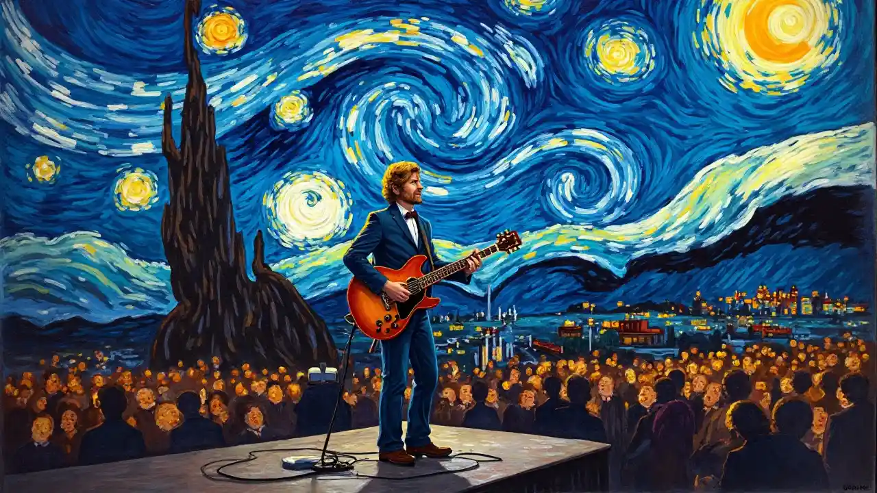 Bintang rock Vincent Van Gogh naik ke panggung dengan band di sebuah festival besar di bawah malam berbintang, lukisan cat minyak Van Gogh gaya, stroke besar