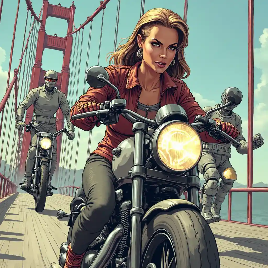 ScottSampul buku komik wanita pengendara motor dikejar robot di jembatan Golden Gate dengan judul VANGUARD.