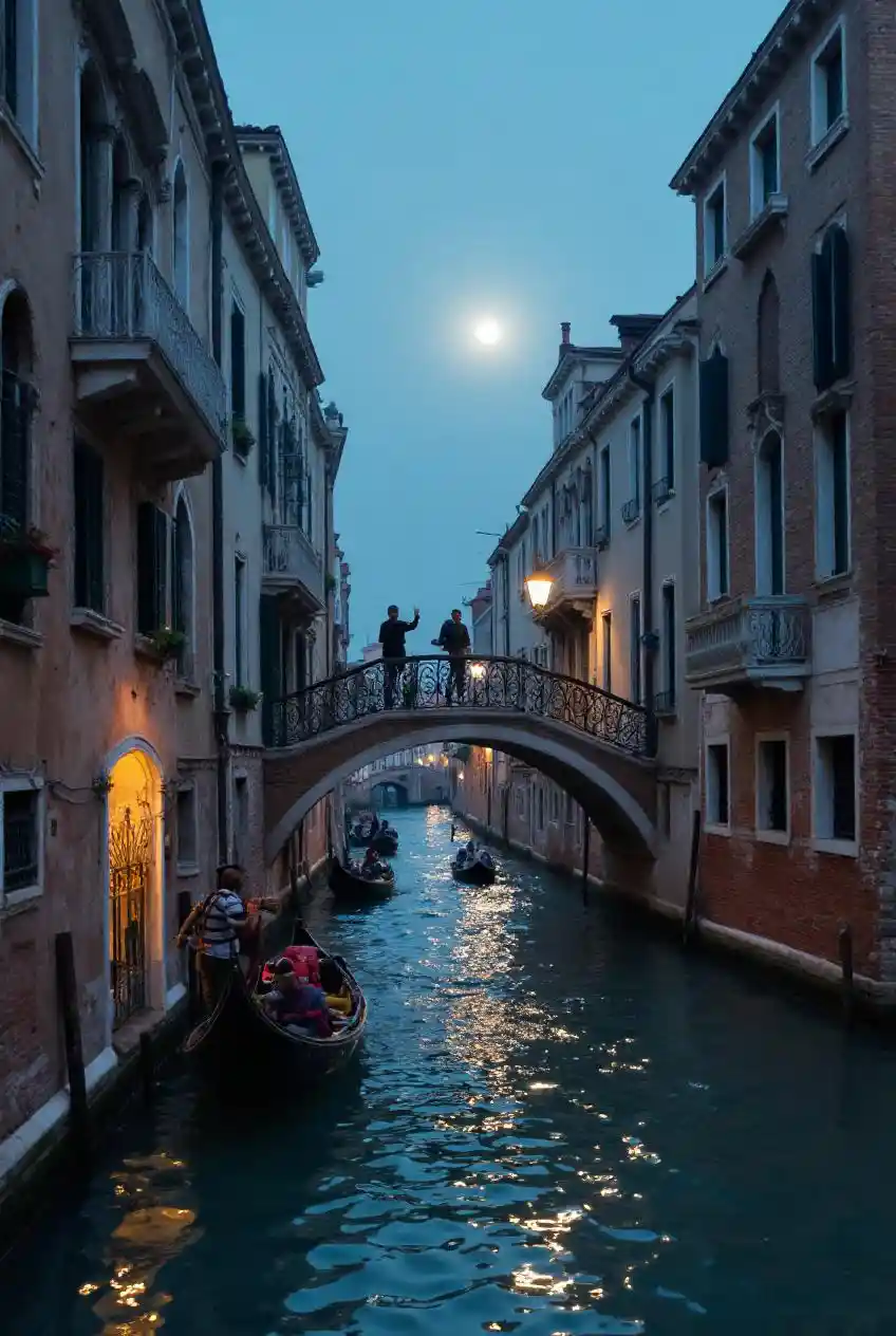 Terusan Venesia yang ramai, di mana para tukang perahu menyanyikan serenade di bawah jembatan di bawah sinar bulan.