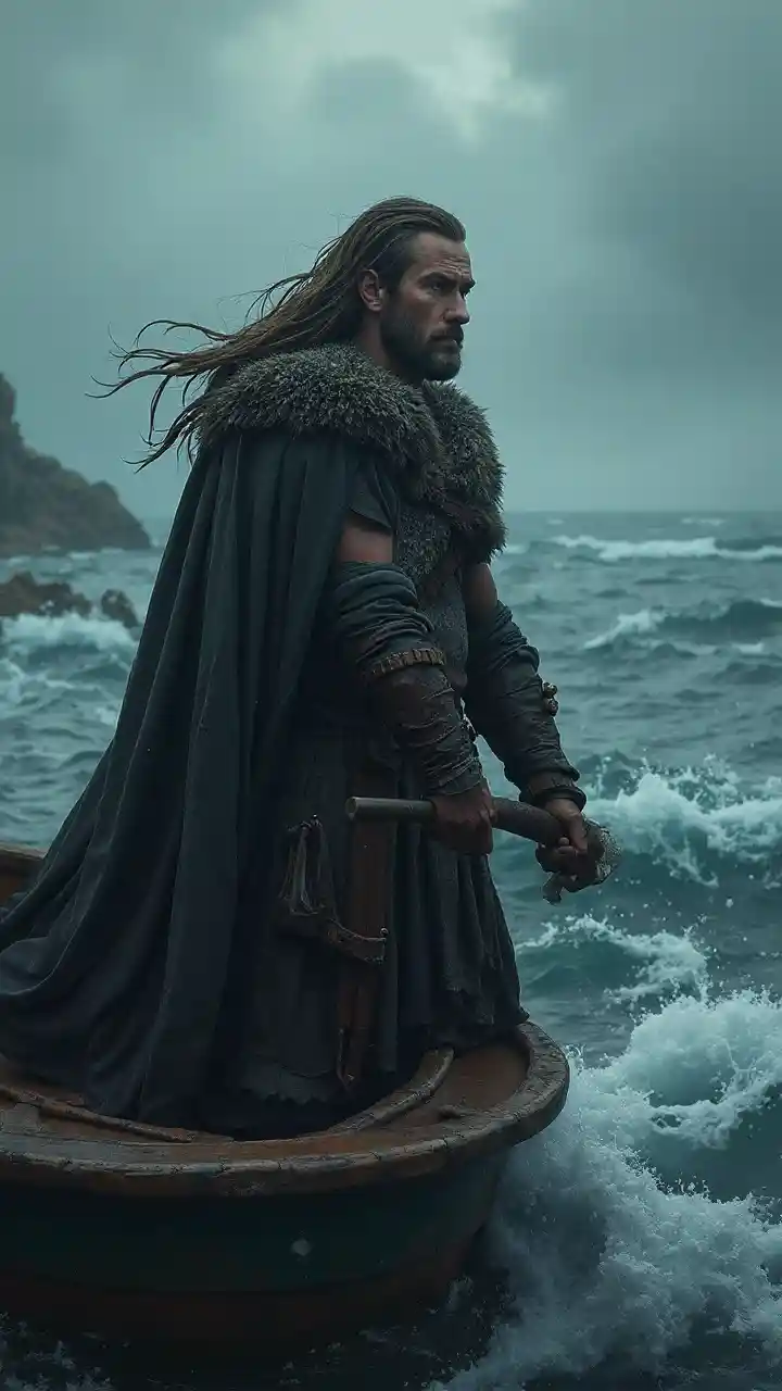 HudsonPotret seni konseptual prajurit Viking berperahu di laut, badai dan cuaca suram