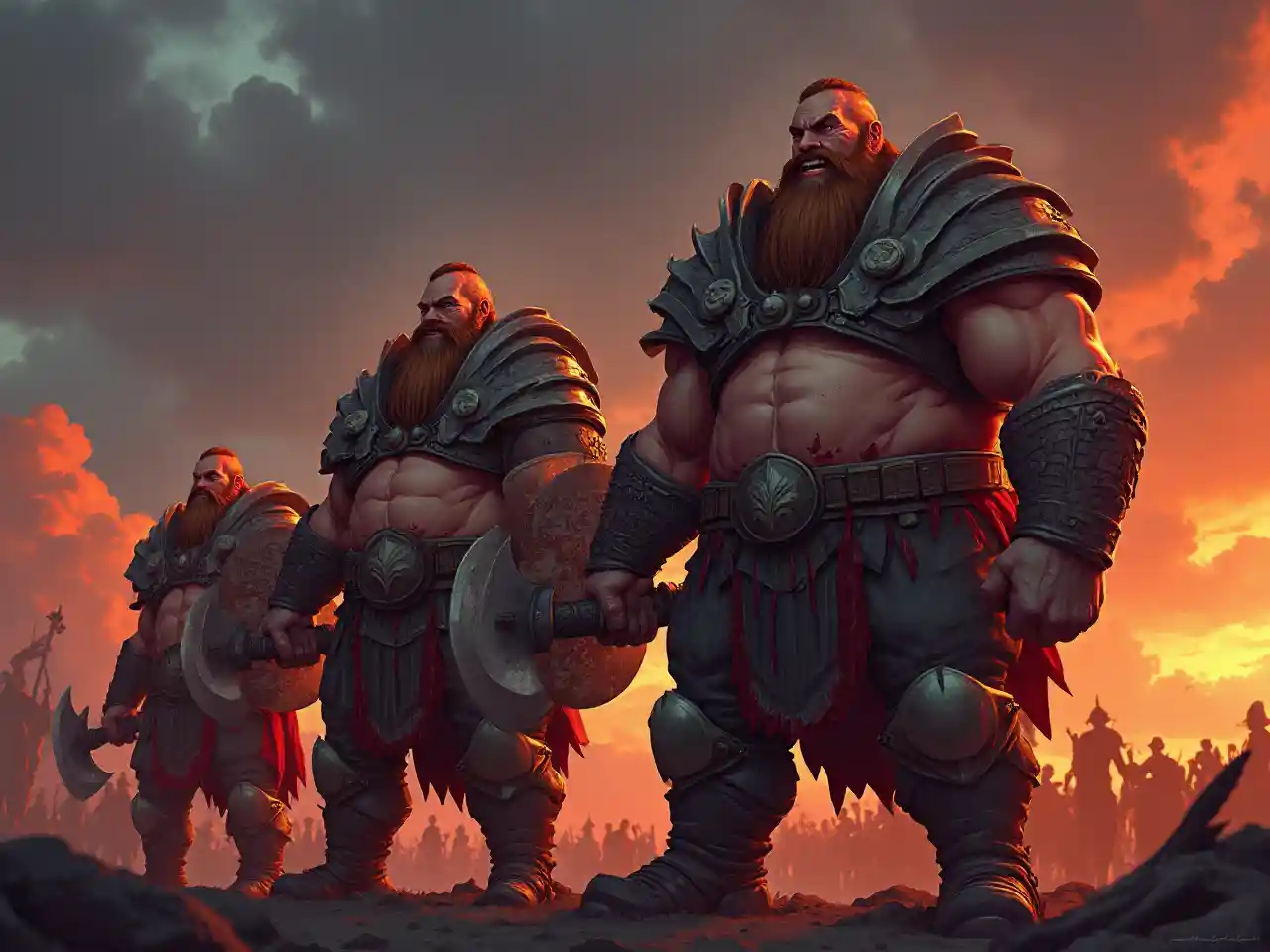Gambar animasi kartun dewasa dari Lord Viking yang mengenakan baju perang, menampilkan tubuh berotot dan dipahat yang berlebihan. Warriors Viking berdiri tegak di medan perang yang redup, dan baju besi mereka yang telah berjuang keras berkilau di bawah cahaya oranye yang memudar dari matahari terbenam. Armor dirancang dengan indah, detail yang dalam dan bersudut serta fitur wajah yang ganas dan berlebihan, dan darah yang menetes mencerminkan cahaya berapi-api dari cakrawala. Wajah-wajah mereka tegas dan ganas, dengan janggut tebal dan mata yang tajam, sementara lengan mereka yang kuat memegang kapak besar dan perisai. Latar belakang adalah campuran dramatis dari langit gelap, angin berputar, dan siluet kekacauan pertempuran yang jauh. Atmosfer tegang dan keras, dan gaya kartun menyeimbangkan bentuk yang dilebih-lebihkan dengan penggambaran yang bergaya namun kuat tentang kekuatan dan kesiapan Viking.