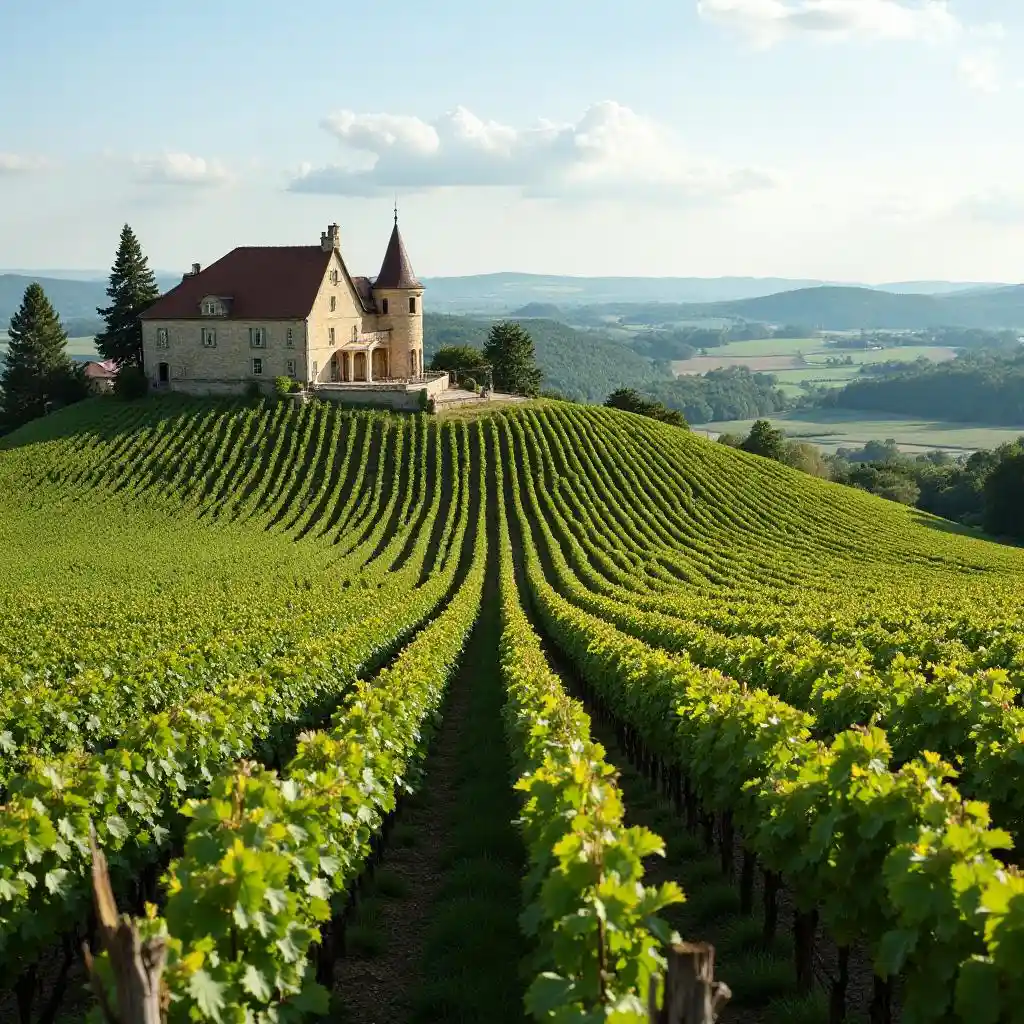 Sebuah kebun anggur yang luas dengan kastil pedesaan yang menghadap ke tanaman merambat yang kaya akan anggur.