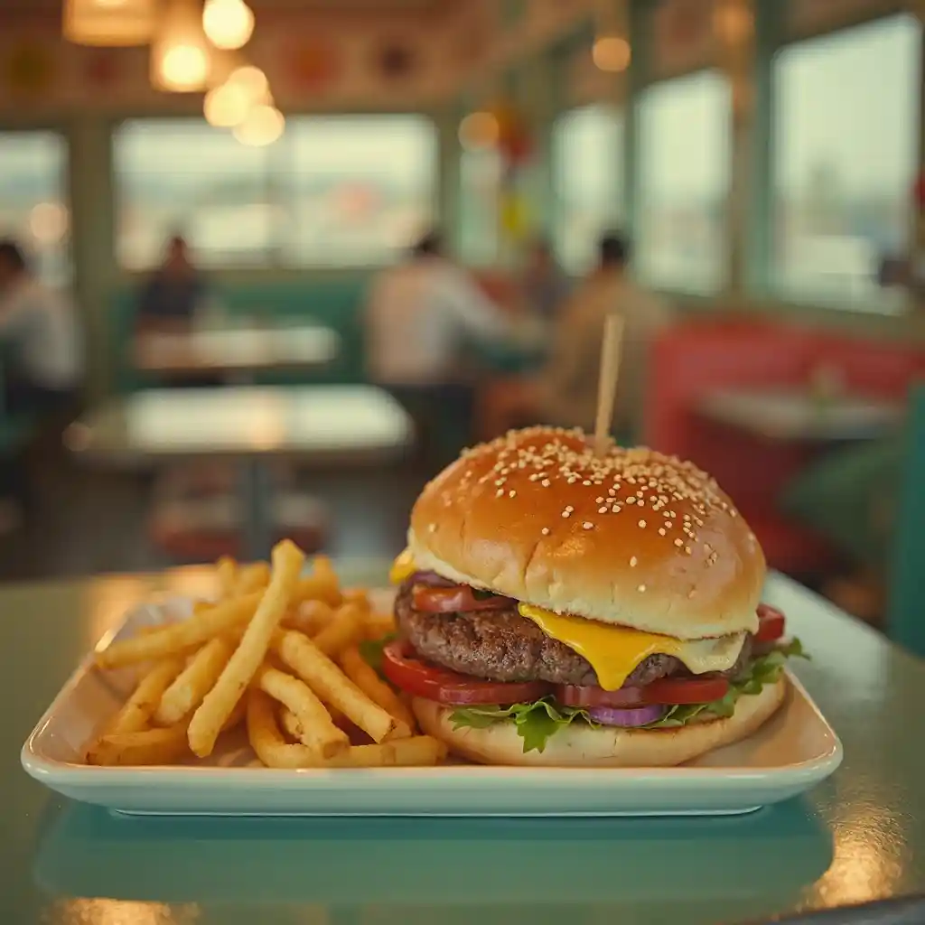 EllaFoto vintage burger dan kentang goreng di nampan di restoran vintage berwarna-warni