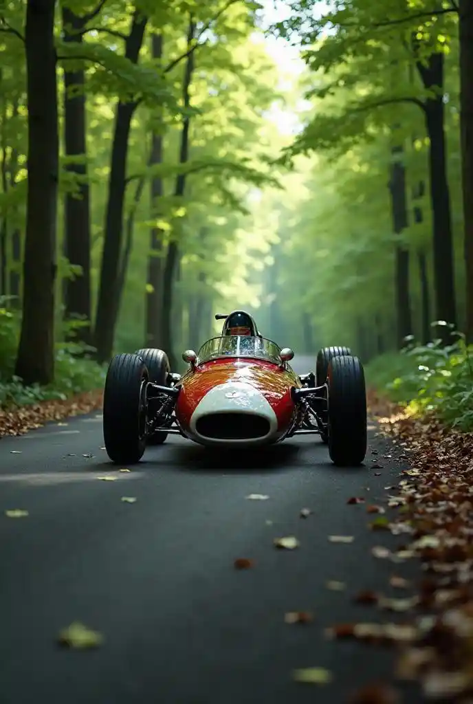 RoyMaserati mobil balap F1 kuno, berkendara melintasi hutan hijau yang segar, memotret dengan lensa transformator, (((flare lensa biru dengan lensa transformator))), depth of field dangkal, (mas