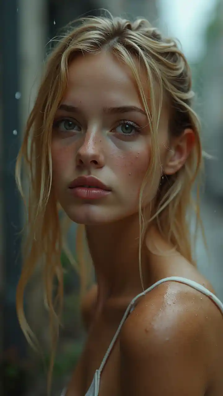 Retro foto RAW tahun 2000an, realistis, butiran film, candid, film bergradasi warna, lampu pengejaran yang menarik, pencahayaan atmosfer, pemotretan makro, pori-pori kulit, cacat, alami, potret wanita pirang yang lucu dan cantik, mata coklat muda, 22 tahun, berdiri di tengah hujan dengan rambut basah menghadap ke bawah, realistis, sangat detail, fotografi format sedang, resolusi 4K
