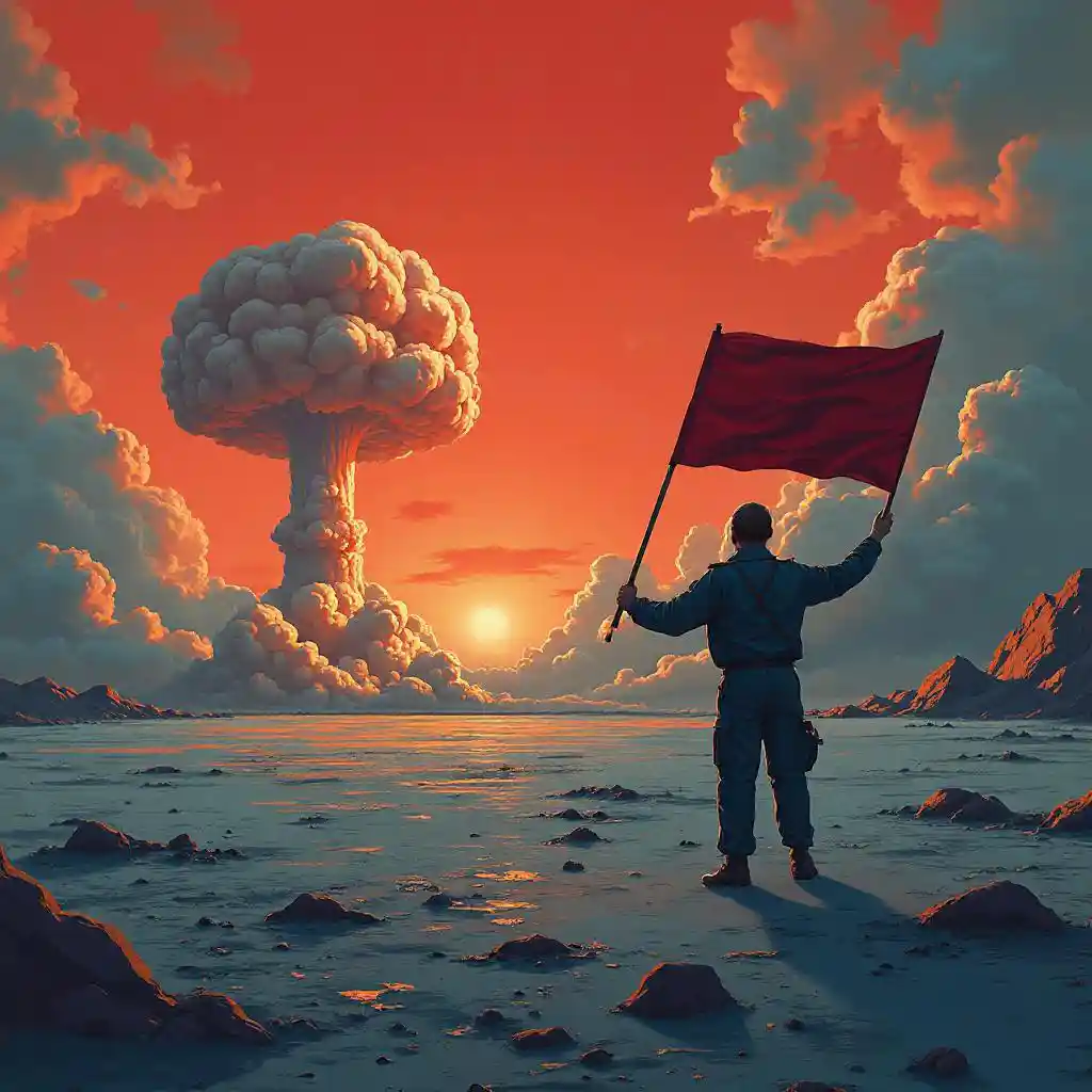 A war field,the floor is blue,the sky is red,in the left an atomic bomb is launching in the right a man is shouting and holding a flag