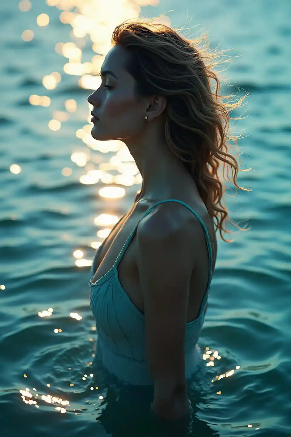 EllaKualitas tinggi, 4K, detail, realistis, rendering berbasis fotografi, tingkat profesional, warna hidup, pemotretan potret wanita mengenakan siluet air mengalir