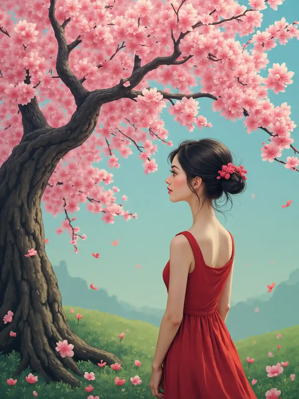 JaxonGambar detail super halus wanita kontemplatif, melihat pohon sakura, membangkitkan waktu, gambar detail aneh