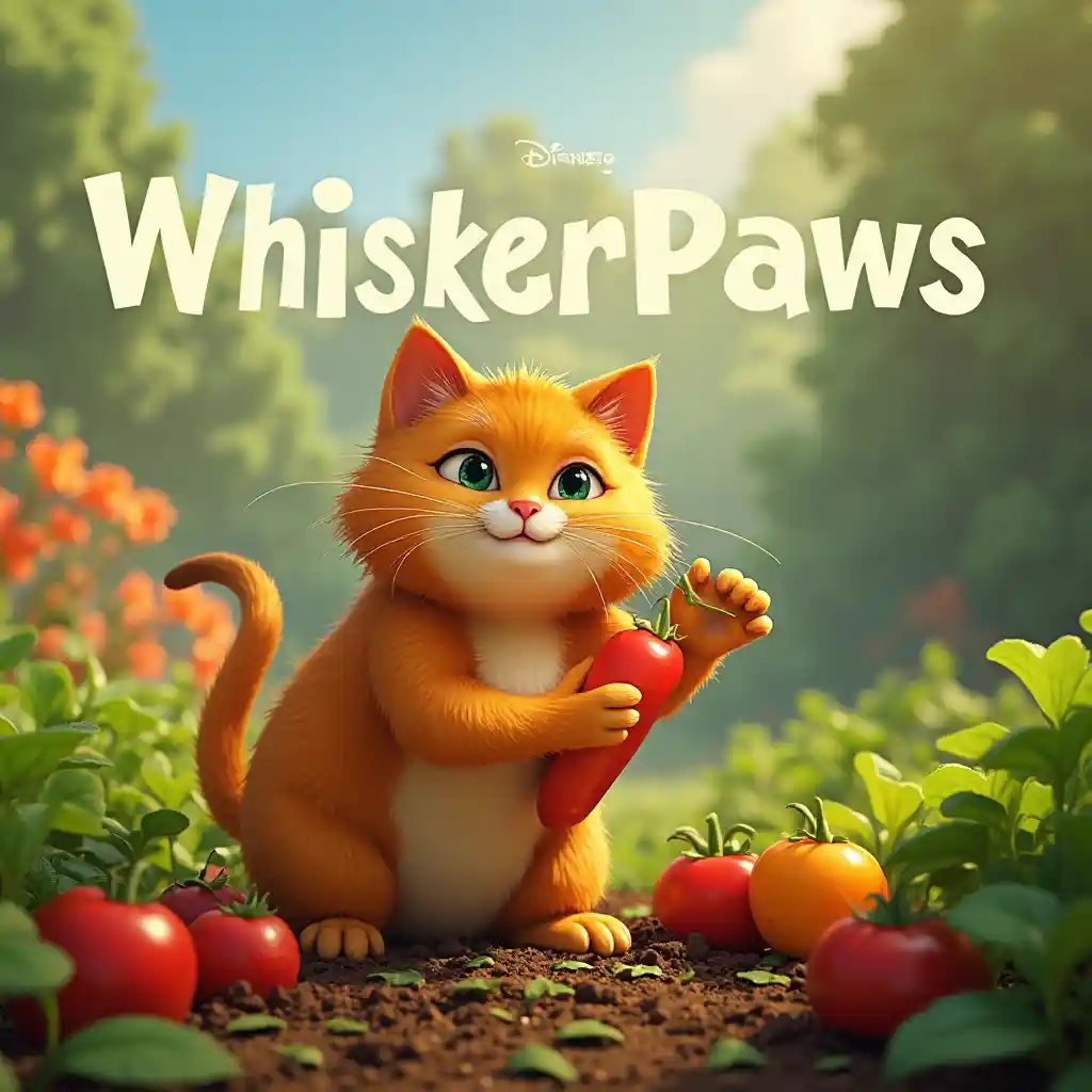 ChloePoster film Disney pixar yang terinspirasi dengan judul Whiskerpaws dalam gambar kucing tabby oranye gemuk yang merawat kebun sayur