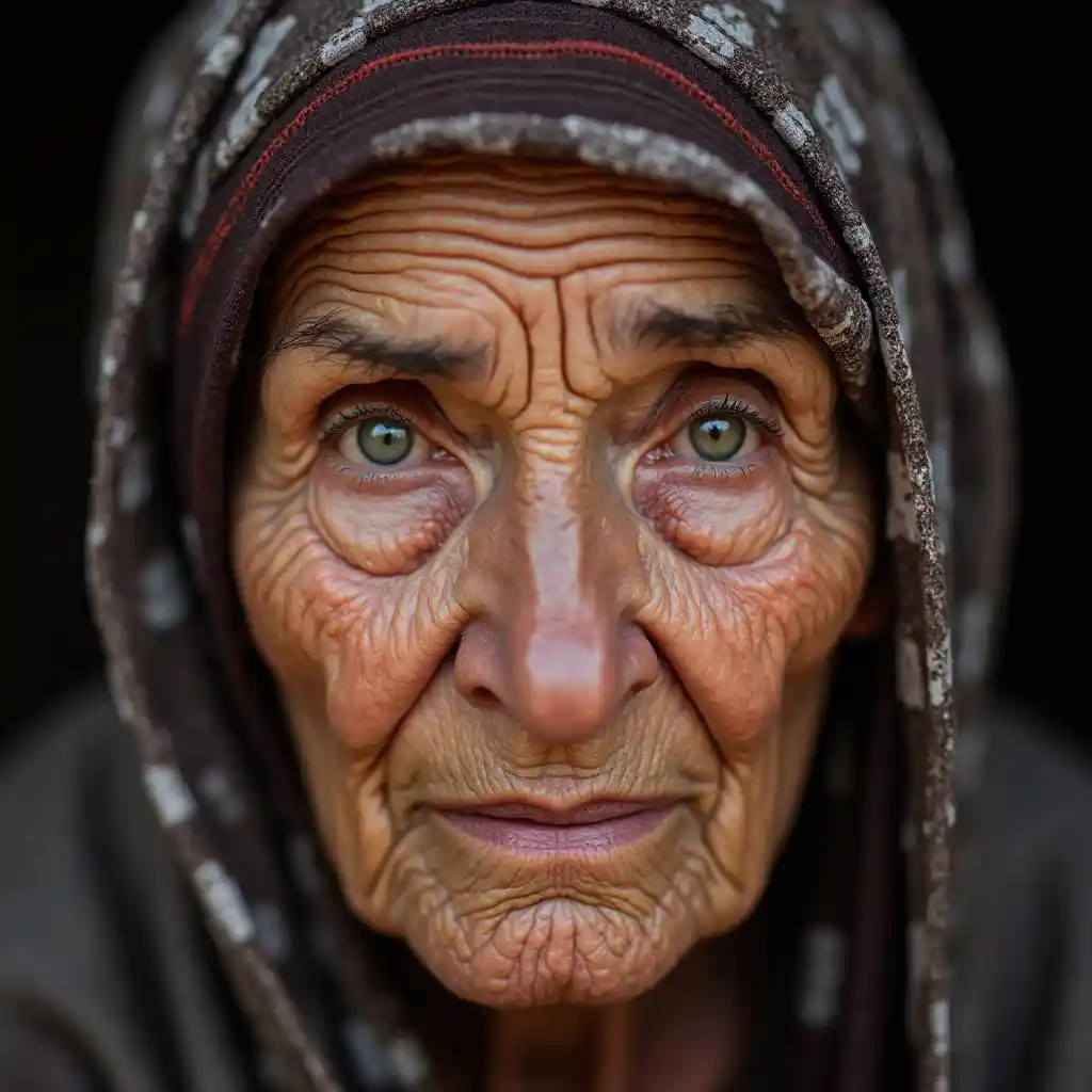 HarperGambar close-up dari seorang wanita tua berjilbab dengan kerutan yang dalam, tatapan mata yang bijak, dan pencahayaan alami yang lembut.