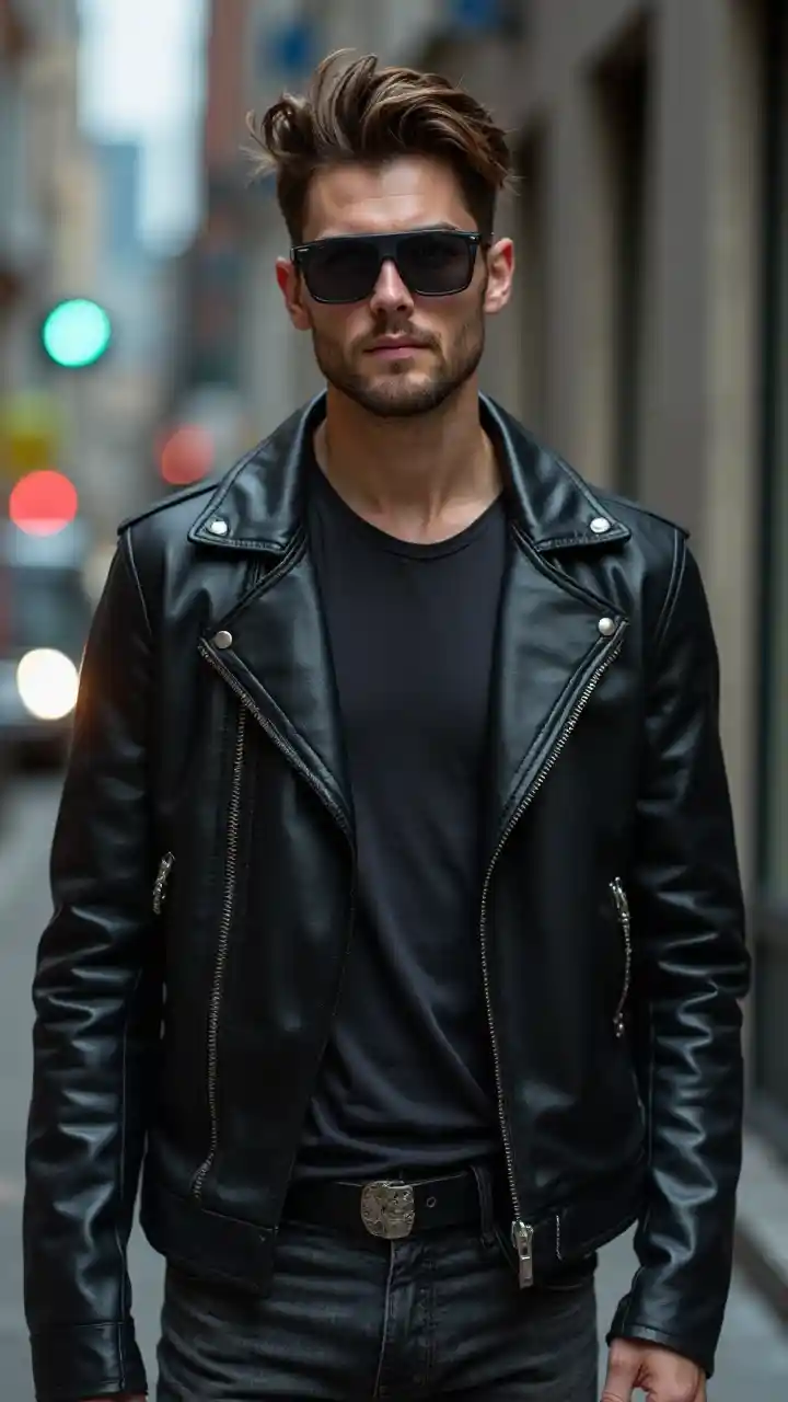 Seorang pria muda (((kecantikan))), fitur mencolok, termasuk tulang pipi yang tinggi, garis rahang yang kuat, luar biasa (((mata abu-abu))), kulit pucat, rambut wajah (hampir tidak terlihat), berpakaian bulat ((jaket kulit hitam)), ((celana jeans cuci batu ketat), (kacamata hitam) memancarkan aura futuristik yang keren
