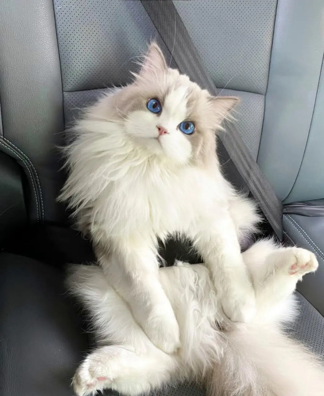 Penampilan aneh dari kucing berbulu yang menawan di kursi kulit