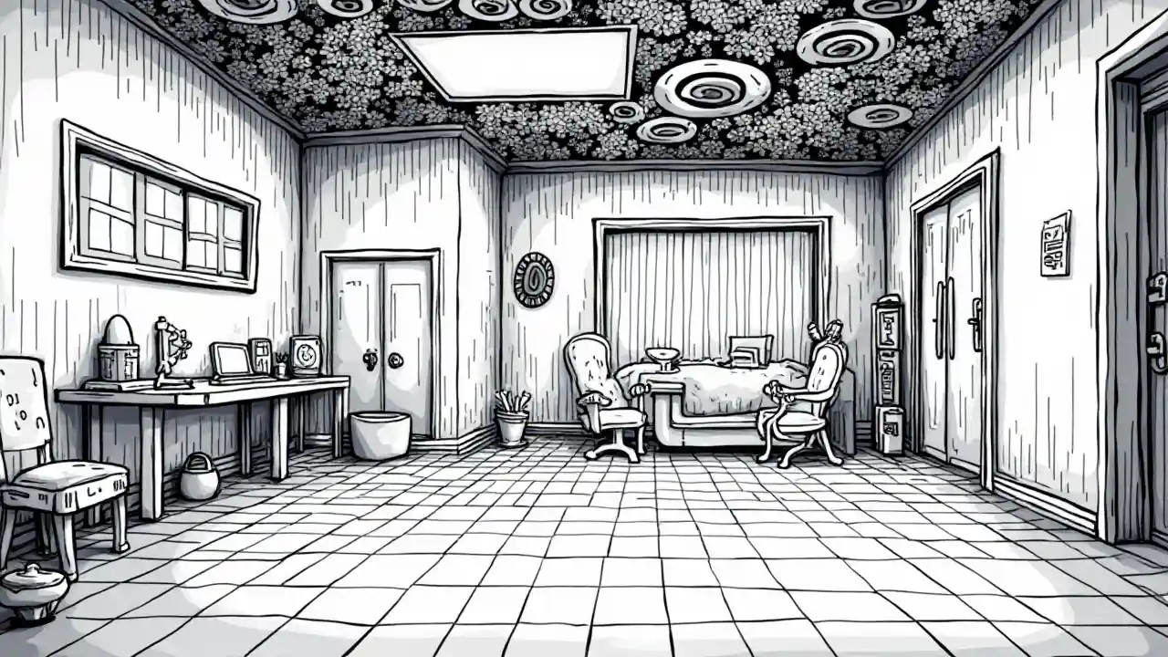 2D room, two dimensional, black and white design, comic style, trippy art, 2d interior design, very detailed, best resolution, excellent quality.