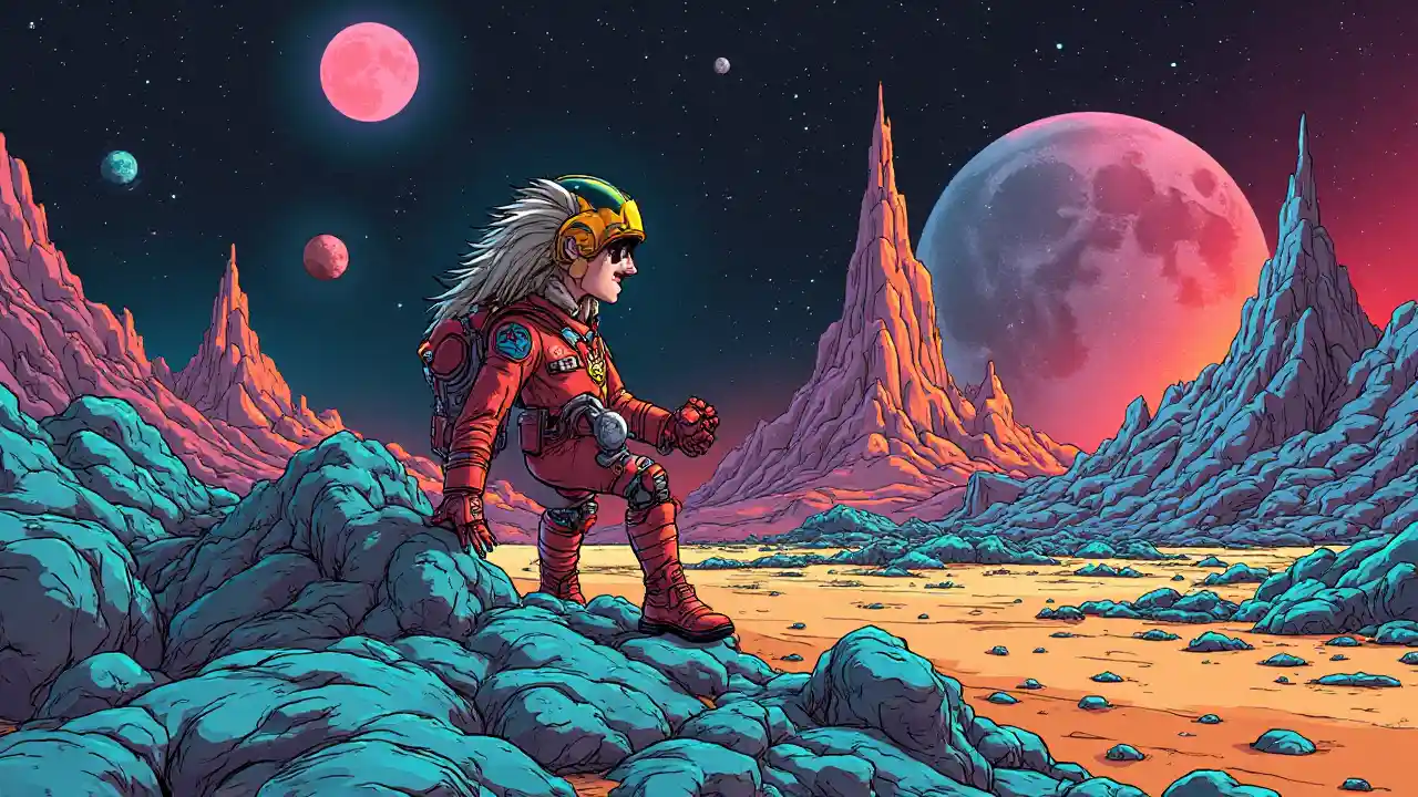 Camilaartwork 80s, space fantasy, hero, 80s style drawing