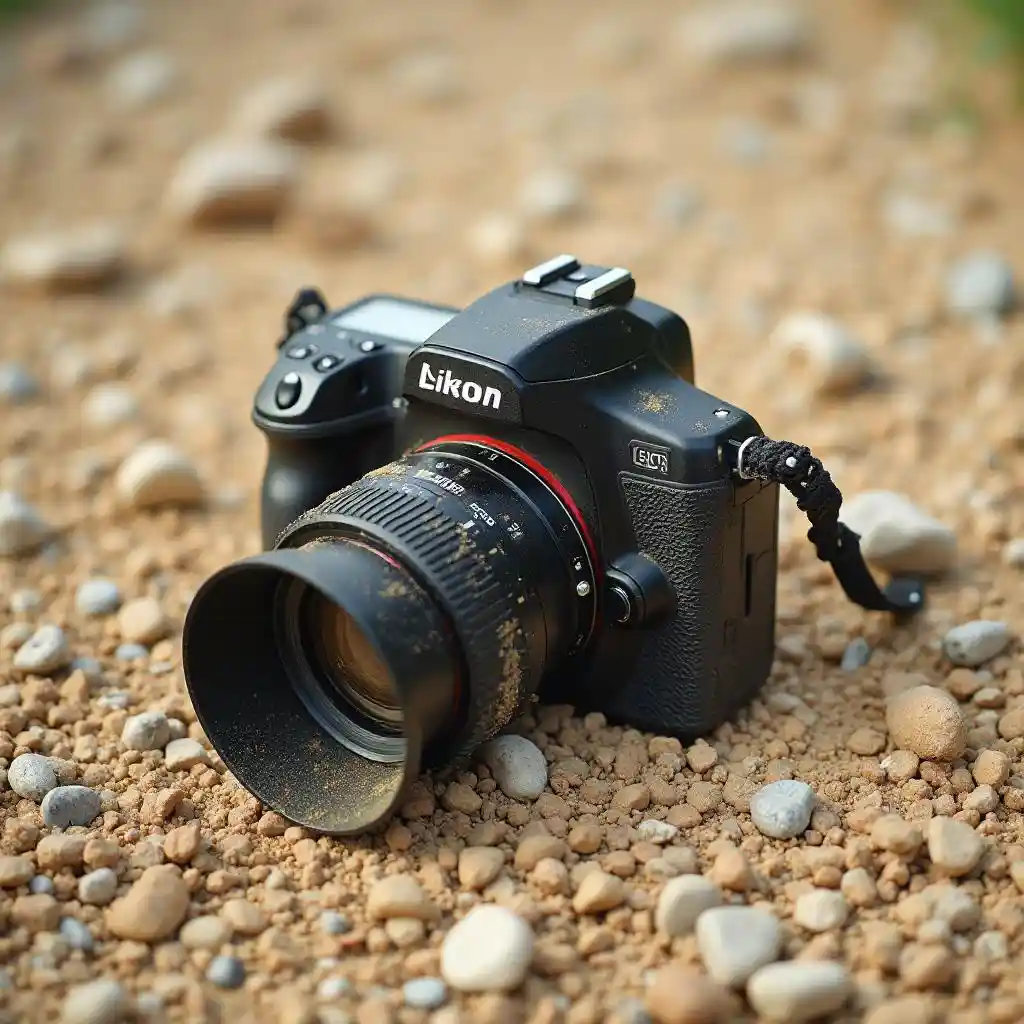 SLR camera rolling on the ground, Damaged and dirty camera, Sand Dust, Camera without owner, Dry and stony ground,